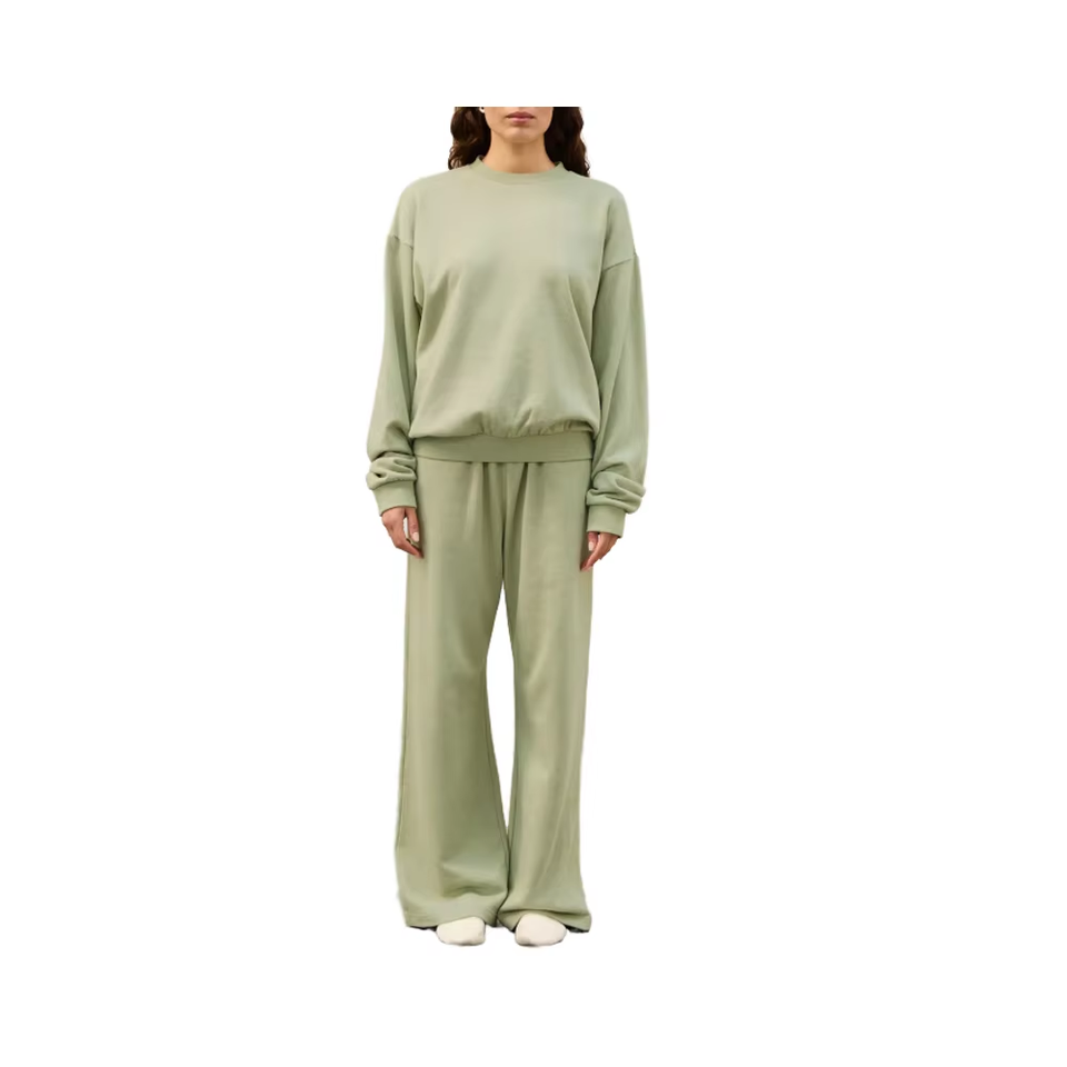 เซ็ตเสื้อสเวตเตอร์กางเกงผ้าฝ้าย100% ลำลองของผู้หญิงปักขนาดใหญ่ฤดูหนาวคอกลมด้านหน้าเอวยางยืดเอวขากว้างสีพื้น