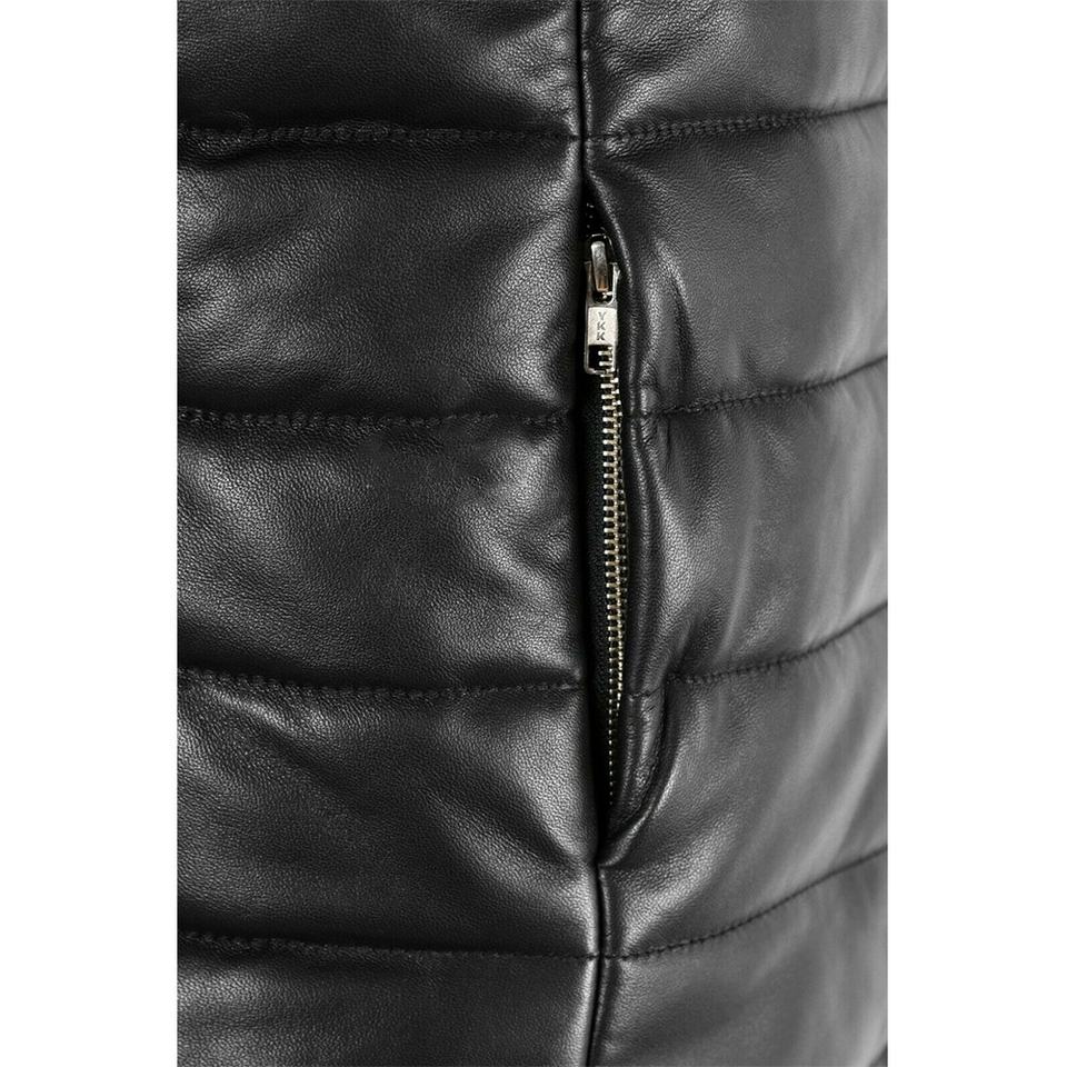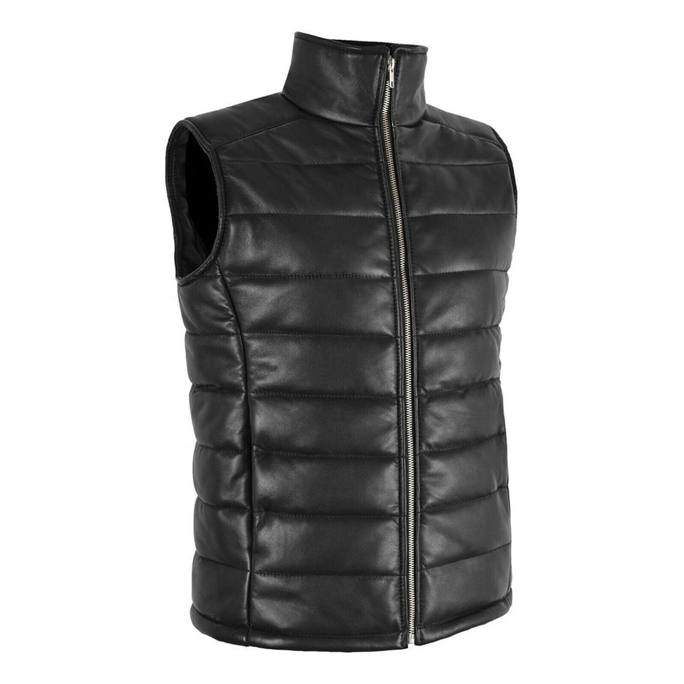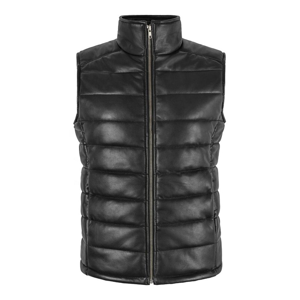 เสื้อกั๊กหนังแท้สีดำสำหรับผู้หญิง สไตล์ลำลอง คอตั้ง บุด้วยใยโพลีเอสเตอร์ ปิดด้วยซิป กันลม เป็นมิตรกับสิ่งแวดล้อม