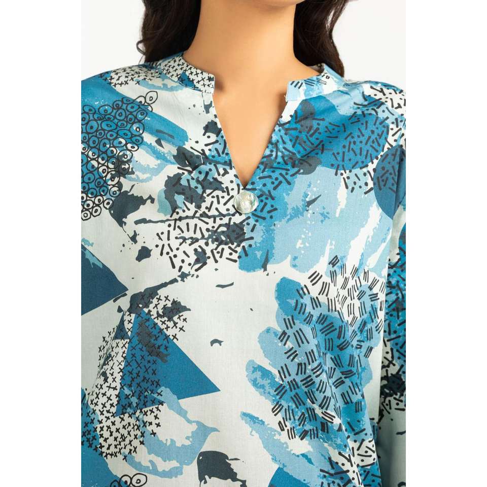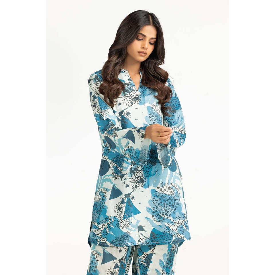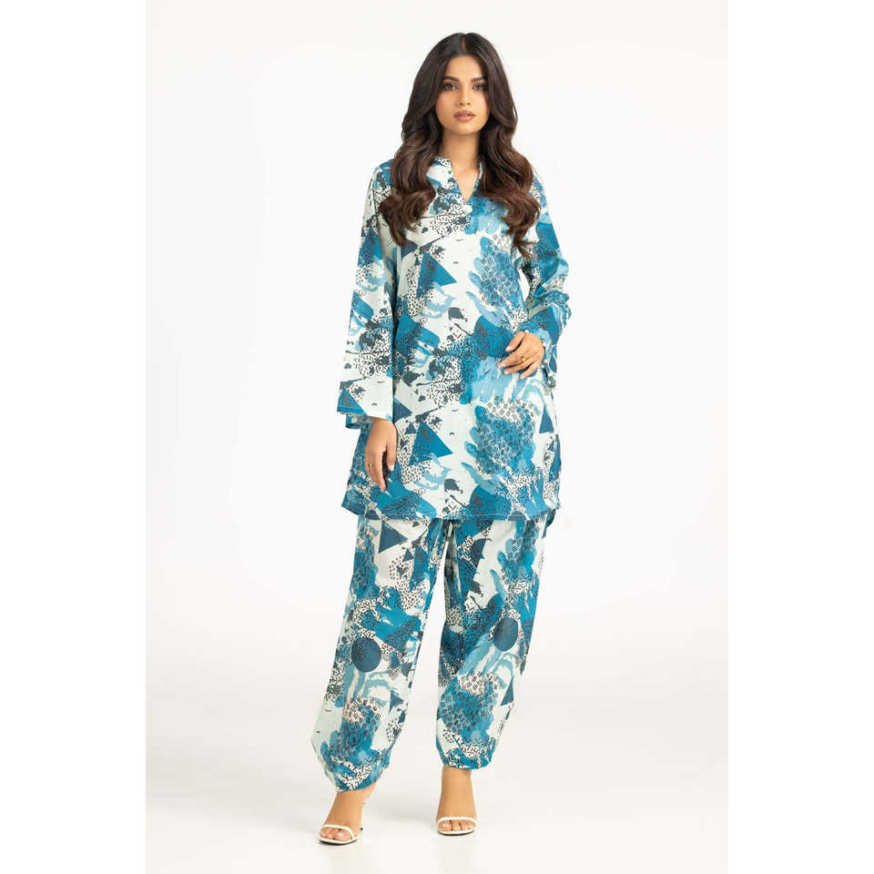 ชุดเซ็ตเสื้อผ้าลำลองสีน้ำเงินพิมพ์ลายสำหรับผู้หญิง ฤดูใบไม้ผลิ/ฤดูร้อน ชุดเครป 2 ชิ้น ไซส์ XS/XS