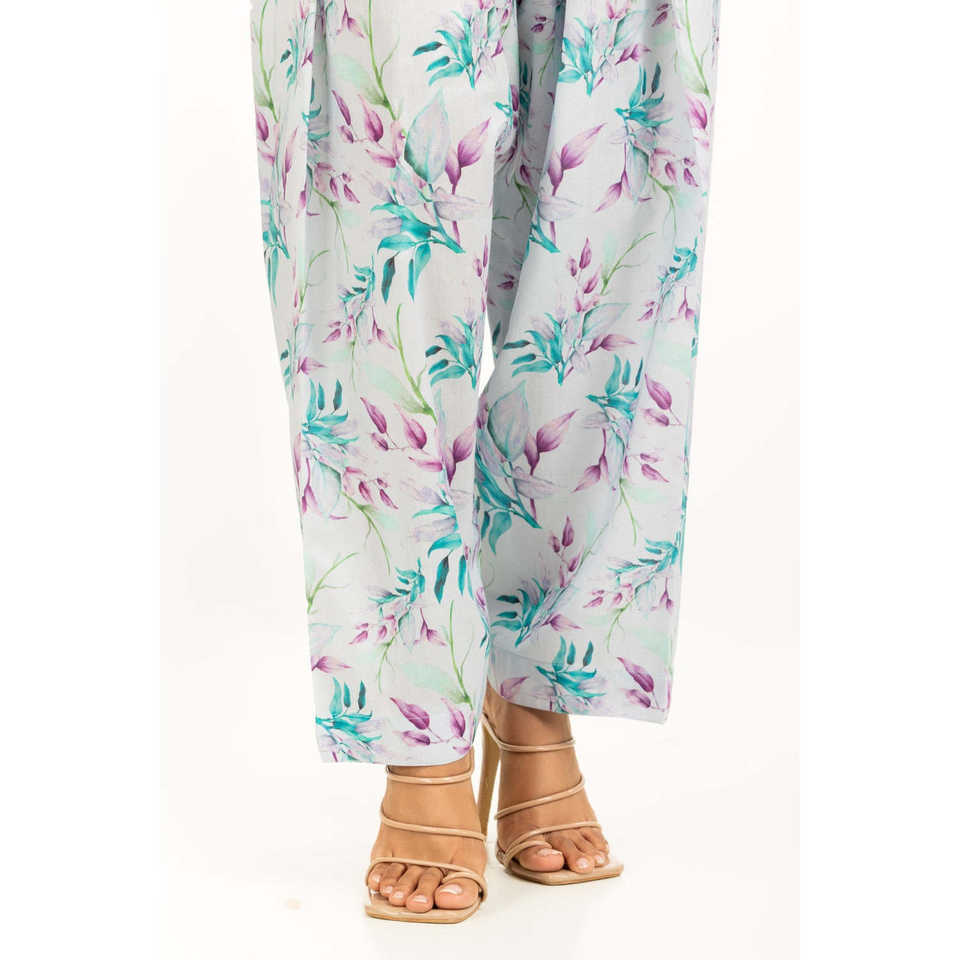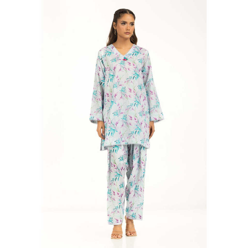 ชุดเซ็ตลำลองสำหรับผู้หญิง สีฟ้าอ่อน ผ้าชีฟองพิมพ์ลาย ชุดสองชิ้นสำหรับฤดูใบไม้ผลิ/ฤดูร้อน เสื้อครอปสั้น ไซส์ 3XL