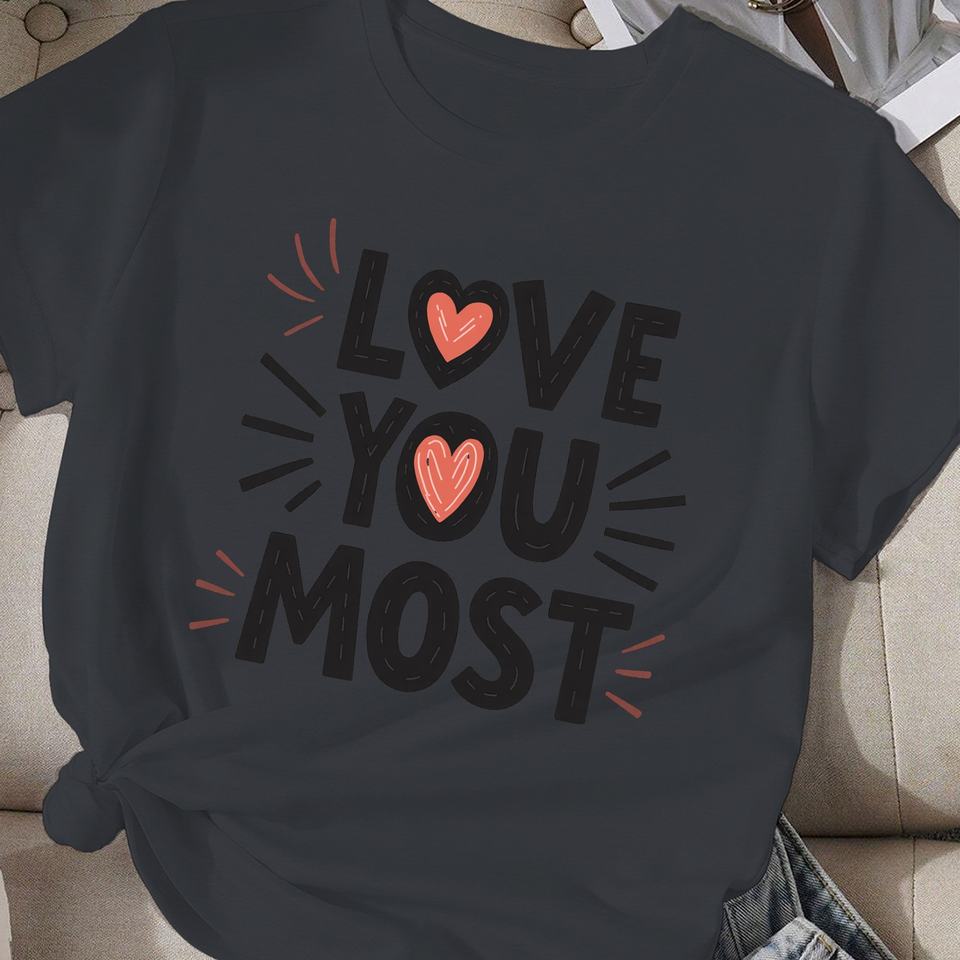 เสื้อยืดลำลองใส่สบายสำหรับผู้หญิงเสื้อยืดพิมพ์ลายหัวใจ 'รักมากที่สุด' ในวัสดุโพลีเอสเตอร์ถัก