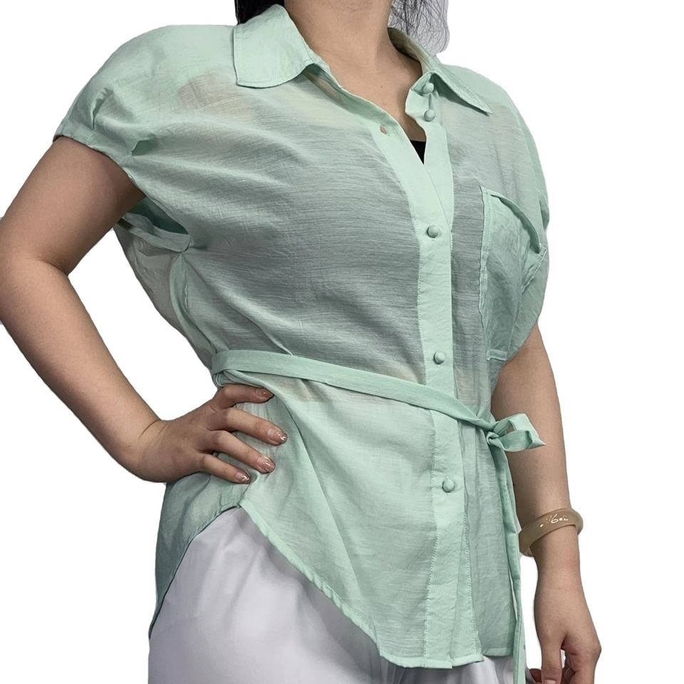 เสื้อผู้หญิงลำลองผ้าฝ้ายลินินแฟชั่นใหม่ เสื้อเชิ้ตแขนสั้นสีพื้นสำหรับฤดูใบไม้ผลิและฤดูร้อน ดีไซน์เรียบหรูแบบครอปท็อป