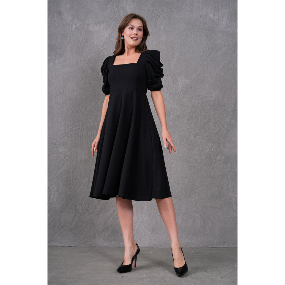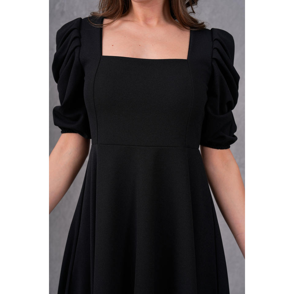 เดรสสีดำผ้าเครปทรงลำลองสำหรับผู้หญิง คอเหลี่ยม แขนสั้น เอวธรรมชาติ รุ่น 080