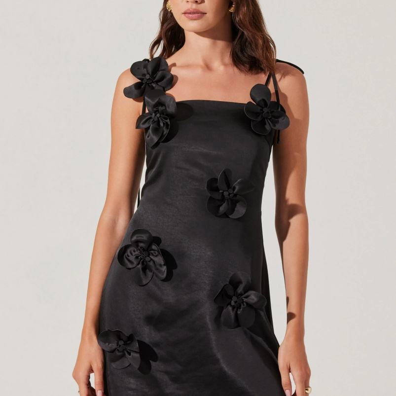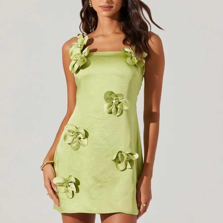 เดรสลำลองสำหรับผู้หญิง3D ลายดอกไม้ปักด้านหลังมีซิปสไตล์หวานๆผ้าทอและซักได้