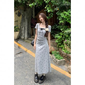 Women's Casual Dresses Short Sleeve One-Piece with Fake Two-Piece Pleated Waist A-Line Long Skirt