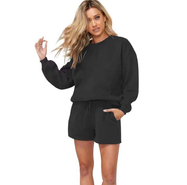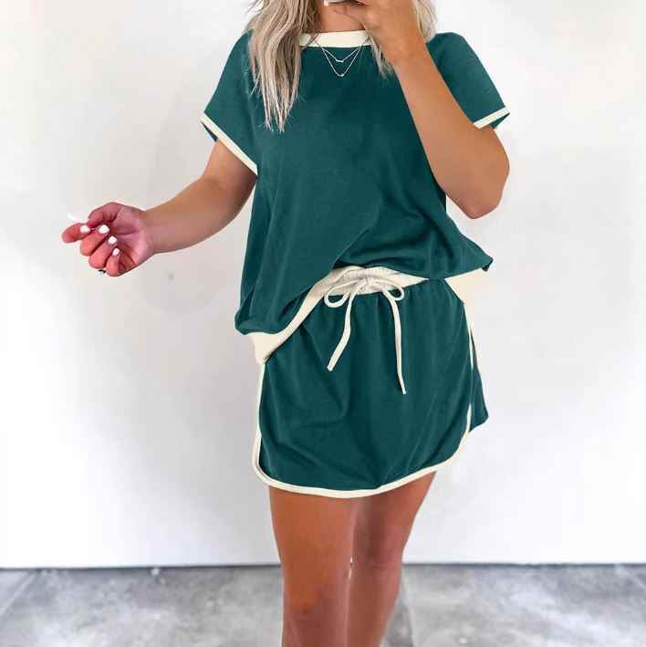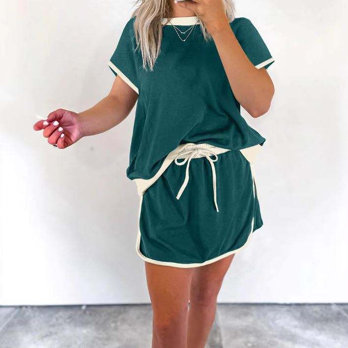 เซ็ตชุดนอน2ชิ้นสำหรับออกกำลังกายแบบลำลองของผู้หญิงชุดออกกำลังกายแบบระบายอากาศได้ดีสำหรับใส่ในเลานจ์เสื้อตัวบนคอกลมมีเชือกผูกเอวกางเกงขาสั้นแขนสั้น