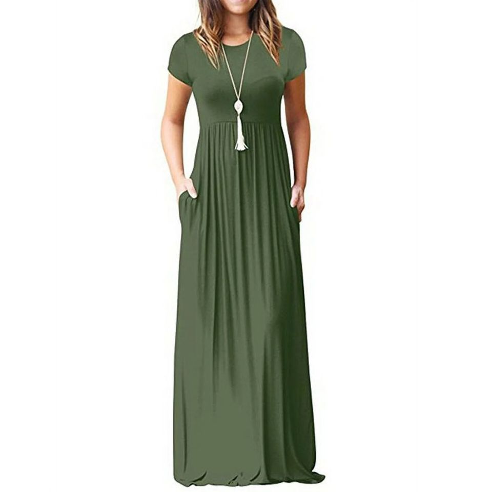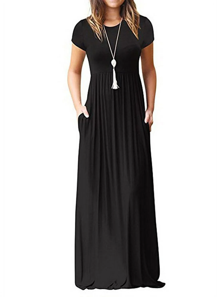เดรสแม็กซี่พิมพ์ลายดอกไม้แบบลำลองของผู้หญิงเดรสยาวนุ่มมีกระเป๋าทรงเอแขนสั้นเอวสูงสีทึบ