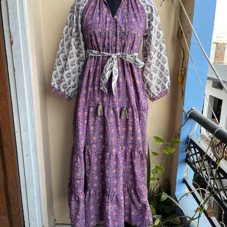 เดรสยาวลายดอกไม้พิมพ์ลายผ้าฝ้ายสไตล์ลำลองสำหรับผู้หญิงขายดีปี 2026 แต่งสีสันแบบ Color Block พร้อมเข็มขัด แขนยาว ทรง Tiered มีกระเป๋า