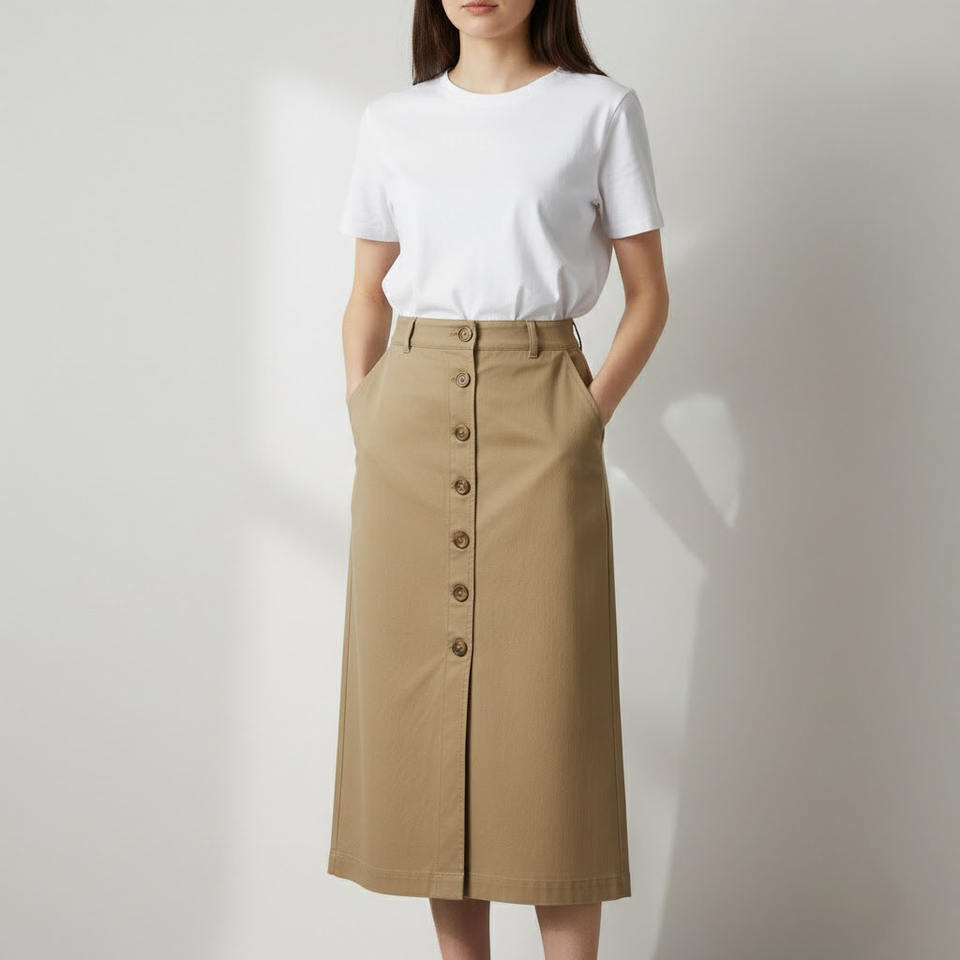 กระโปรงยาวคลุมเข่ามีกระดุมทรงเอสีกากีลำลองของผู้หญิง