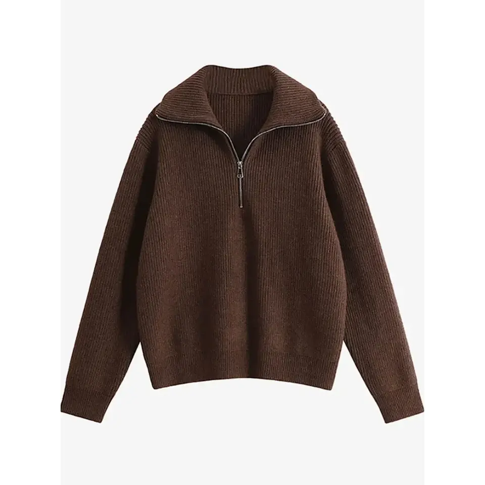 เสื้อสเวตเตอร์ถักแบบสวมศีรษะสำหรับผู้หญิงเสื้อสเวตเตอร์คอเต่าแขนยาว2024สีเขียวทึบมีซิปสีน้ำตาลเข้ม L