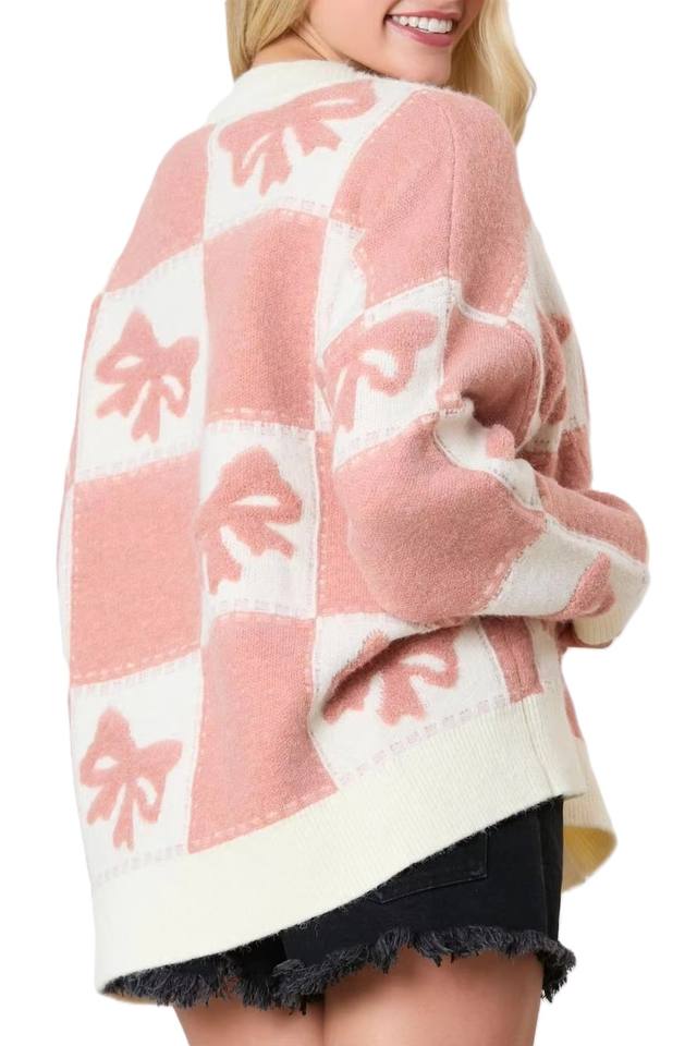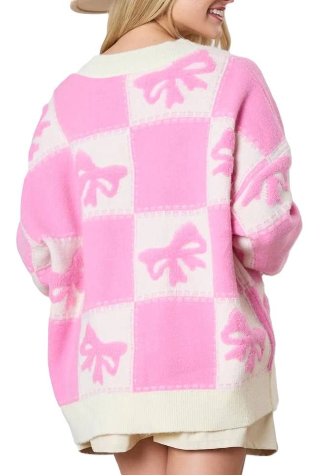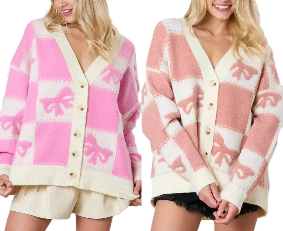 เสื้อคลุมคาร์ดิแกนถักแขนยาวลำลองสำหรับผู้หญิง คอวี ลายโบว์ ติดกระดุม ผ้าระบายอากาศดี ดีไซน์สีตัดกัน เหมาะสำหรับฤดูใบไม้ผลิ