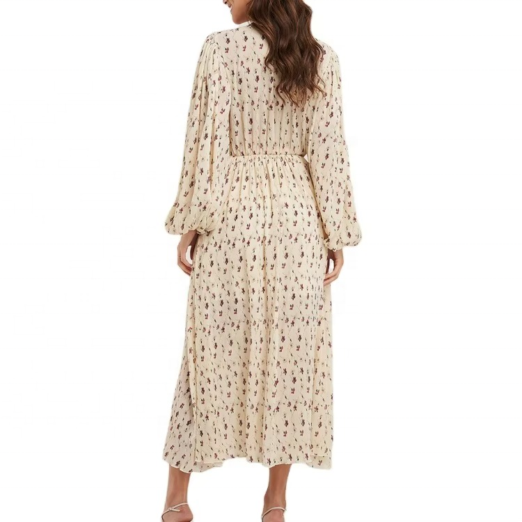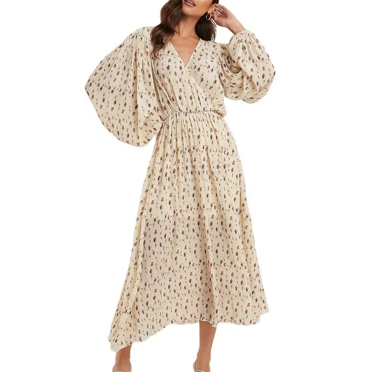 เดรสยาวลำลองสำหรับผู้หญิง ลายดอกไม้ แขนยาวทรงบอลลูน เอวธรรมชาติ ซักได้ ดีไซน์ทับด้านหน้า