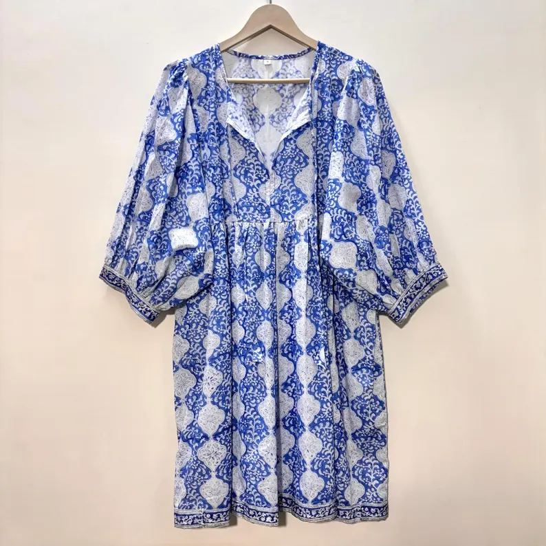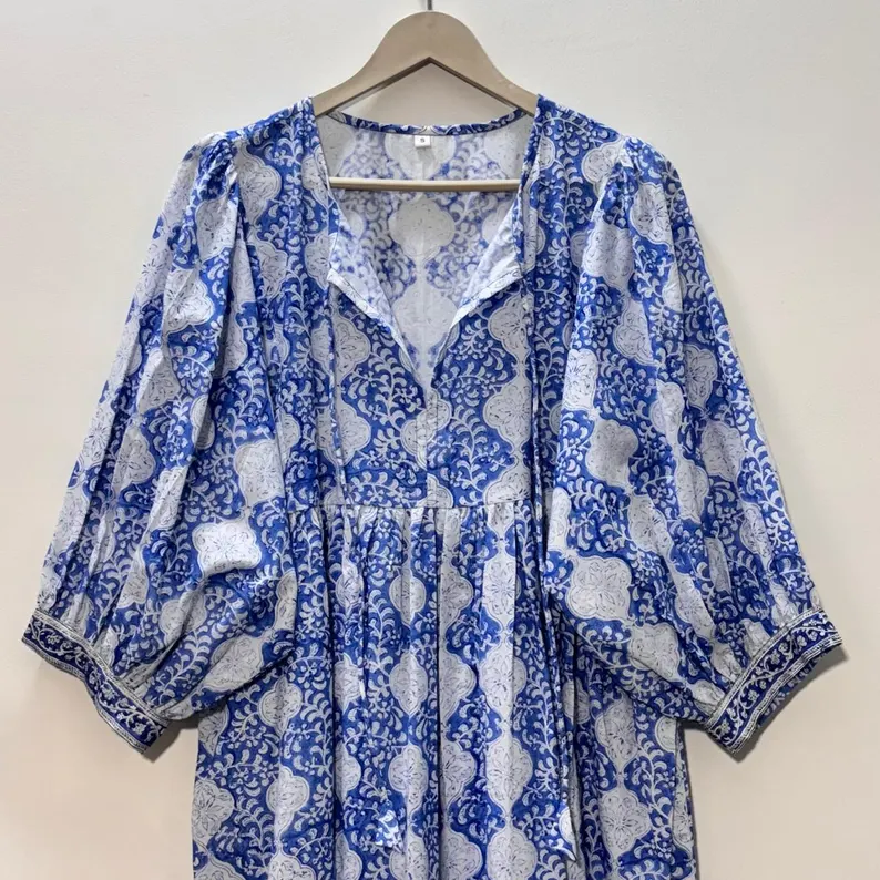 เดรสลำลองผู้หญิงผ้าฝ้ายทรงมิดิ แขนทรงบอลลูน เอวทรงเอ็มไพร์ ทรงเบบี้ดอลล์ ชุดฤดูร้อน ผ้าฝ้าย 100% ทรงหลวม คอวี