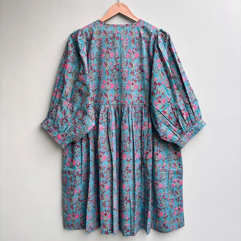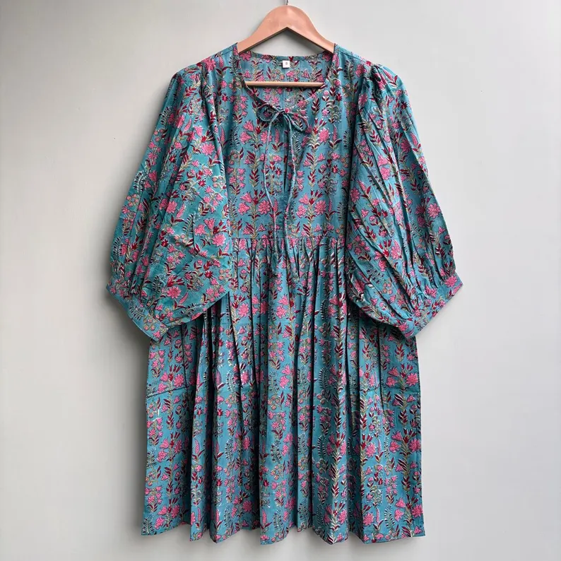 เดรสลำลองผู้หญิงผ้าฝ้ายทอแบบเรียบ ความยาวปานกลาง แขนสั้น ทรงเอ็มไพร์ เอวสูง ทรงเบบี้ดอลล์ โอเวอร์ไซส์ คอวี ทรงหลวม ใส่สบาย