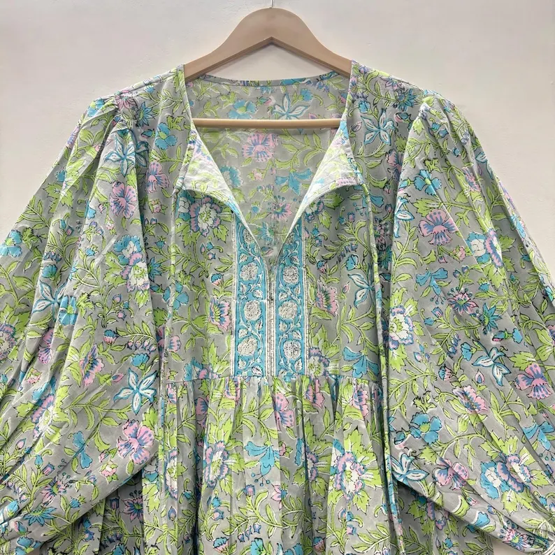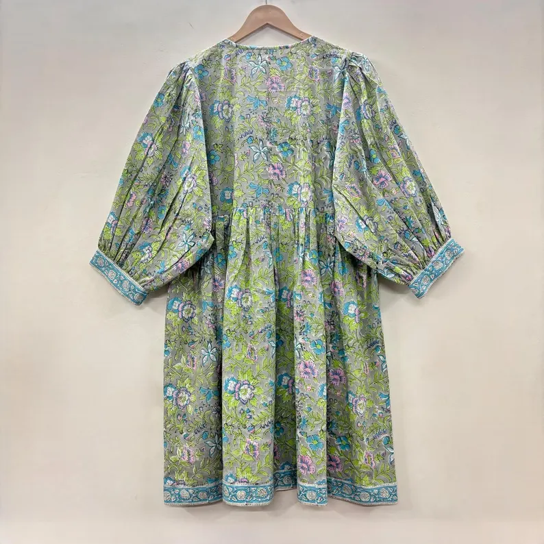 เดรสลำลองผู้หญิงผ้าฝ้ายทอแบบเรียบ ความยาวปานกลาง แขนสั้น ทรงเอ็มไพร์ เอวสูง ทรงเบบี้ดอลล์ โอเวอร์ไซส์ คอวี ทรงหลวม สไตล์ราชสถาน