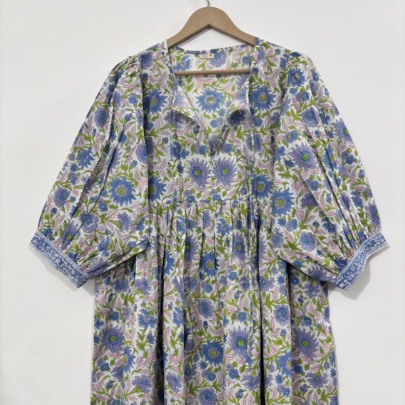 เดรสลำลองผู้หญิงผ้าฝ้ายทอลายดอกไม้ แขนทรงบอลลูน เอวทรงเอ็มไพร์ ทรงเบบี้ดอลล์ ผ้าฝ้าย 100% ทรงหลวม คอวี