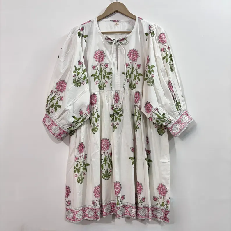 เดรสลำลองผู้หญิงผ้าฝ้ายทอลายดอกไม้ แขนทรงบอลลูน เอวทรงเอ็มไพร์ ทรงเบบี้ดอลล์ คอวีทรงโอเวอร์ไซส์ ทรงหลวม