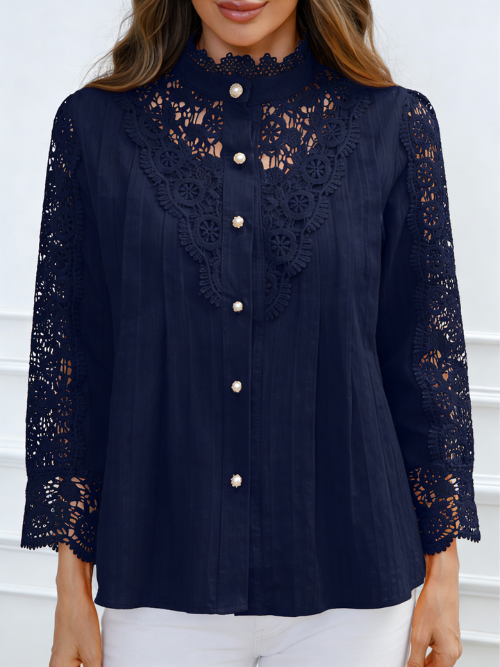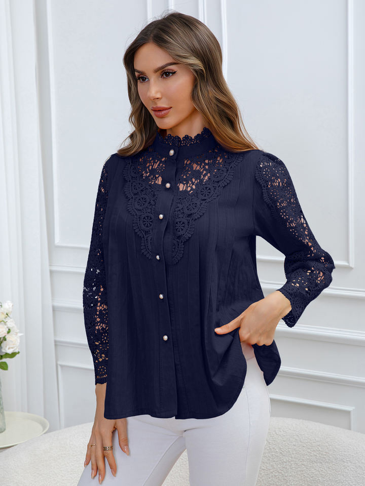เสื้อเชิ้ตทำงานลำลองสำหรับผู้หญิง ตกแต่งด้วยลูกไม้ แขนยาว ผ้าถัก ทรงปกติ เหมาะสำหรับฤดูใบไม้ผลิ/ฤดูร้อน และฤดูใบไม้ร่วง
