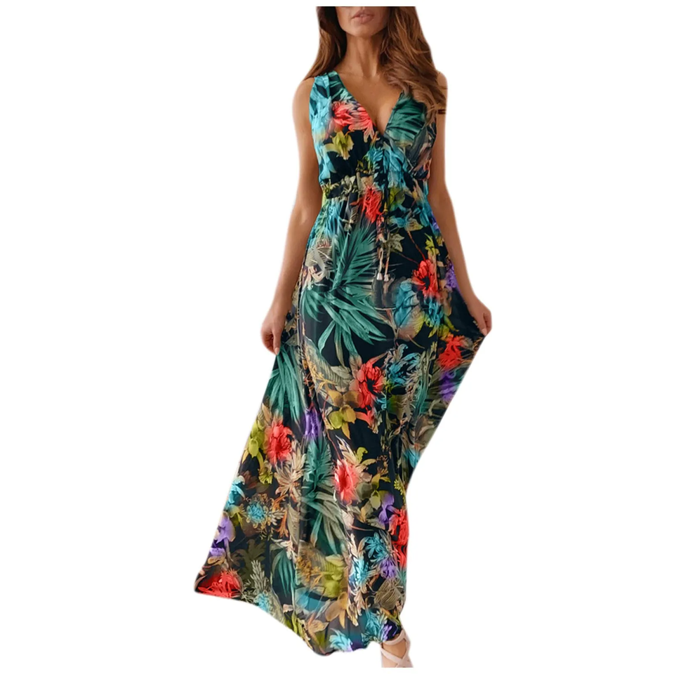 Women's Casual Print for Bandage Elastic Waist V-Neck Sleeveless Summer Dress Sexy Long Maxi Vestidos Moda 2024