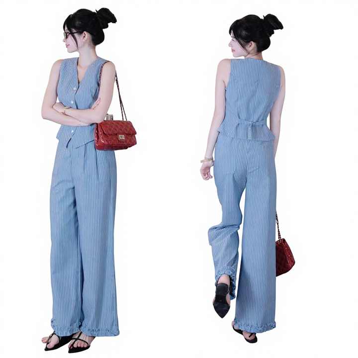 ชุดเซ็ต 2 ชิ้น เสื้อแขนยาวคอวีเอวสูงสำหรับผู้หญิง สไตล์ลำลอง ผ้าฝ้ายทอเนื้อแน่น สวมใส่สบาย ระบายอากาศได้ดี