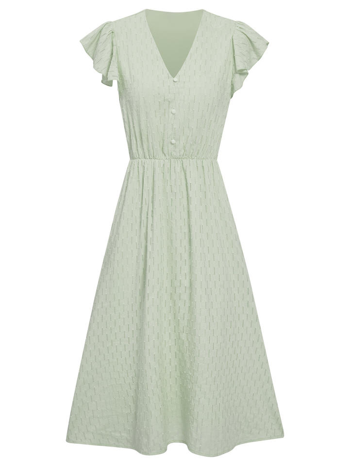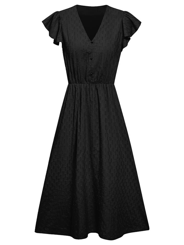 Women's Casual Solid-Color V-Neck Waist-Defining Ruffled Short-Sleeve Dresses Fashion