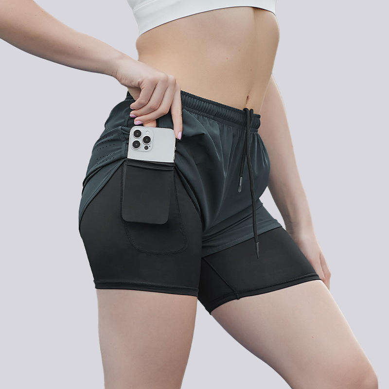กางเกงขาสั้นกีฬาลำลองสำหรับผู้หญิงกางเกงขาสั้นสองชิ้นมีกระเป๋าป้องกันการเปิดรับแสง