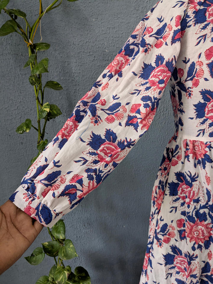 เดรสยาวปานกลางแขนยาวลายดอกไม้พิมพ์ลายด้วยมือสไตล์โบฮีเมียนผ้าฝ้ายทอแบบเป็นมิตรกับสิ่งแวดล้อมสำหรับฤดูร้อนแบบลำลองสำหรับผู้หญิง