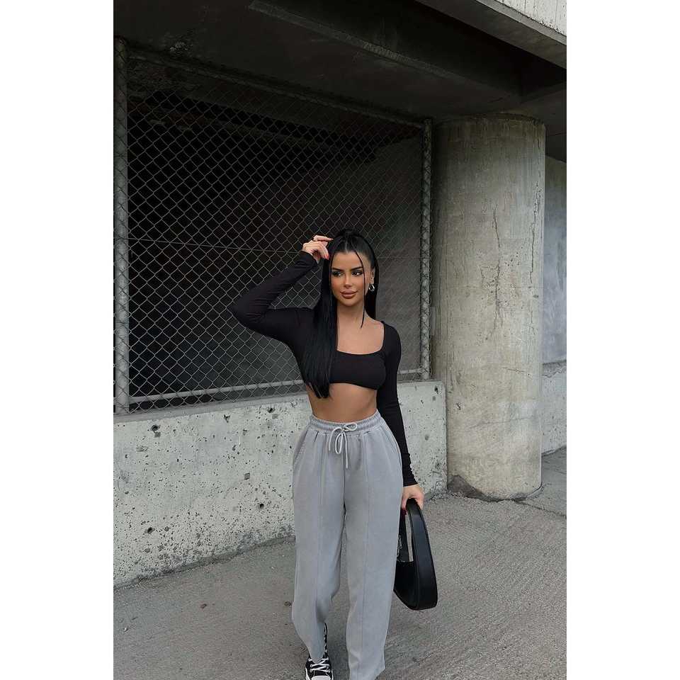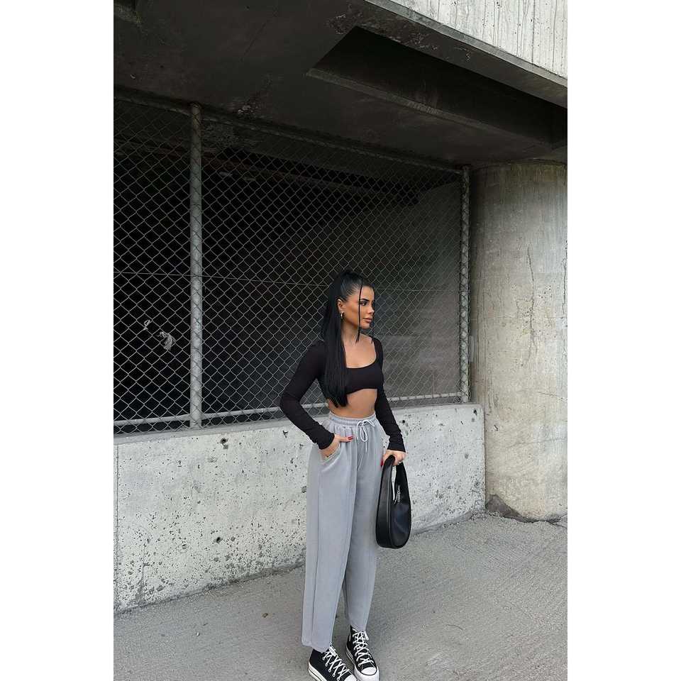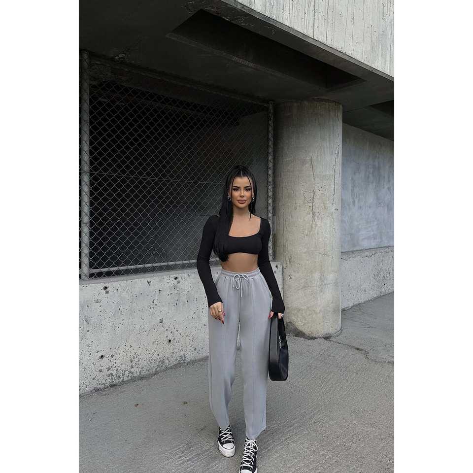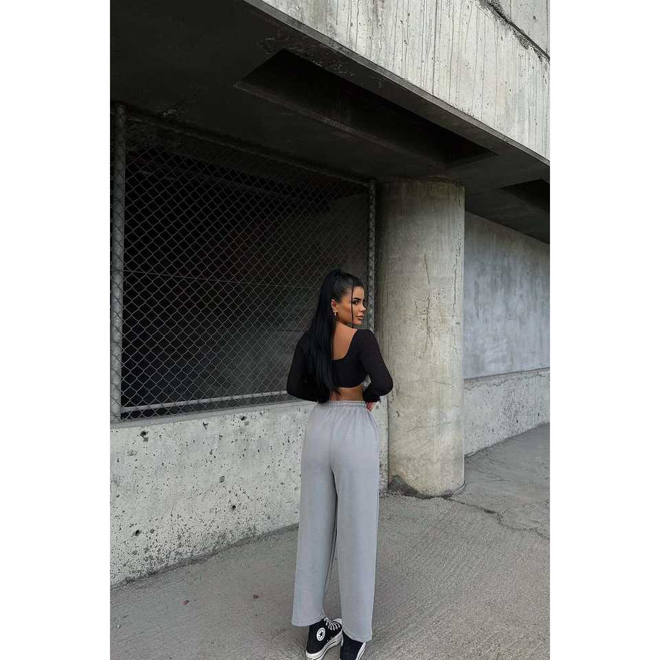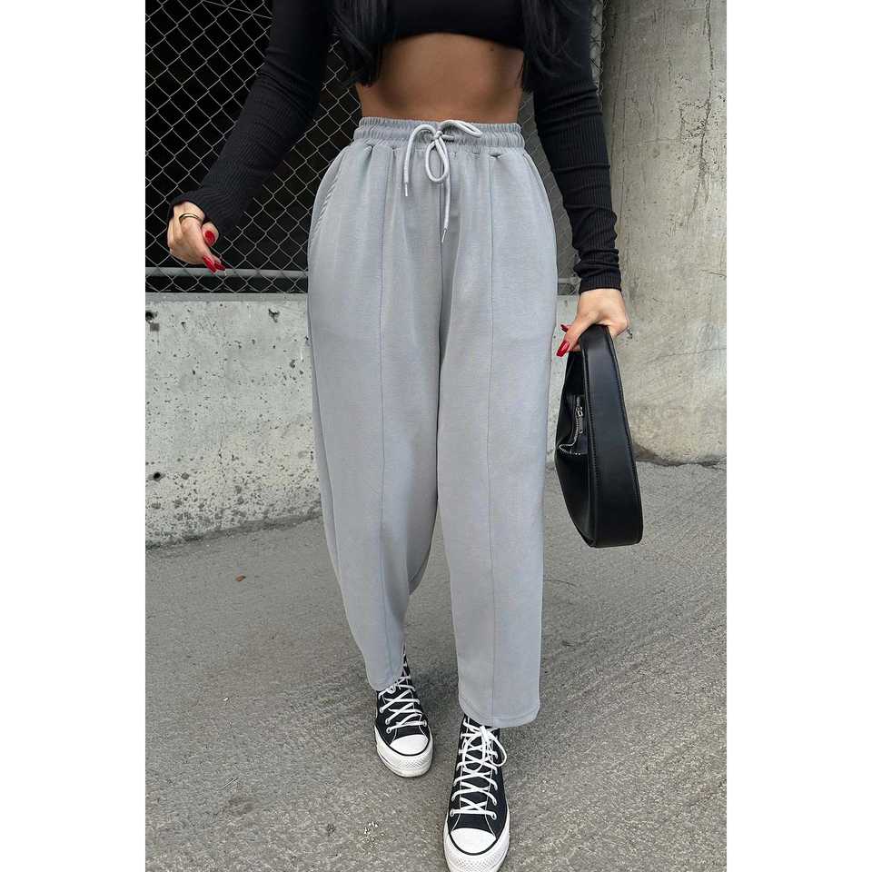 กางเกงลำลองผู้หญิงสีเทาเอวสูงทรงขาบานพร้อมเชือกผูก ระบายอากาศได้ดี ไซส์ 3XL สีวอช