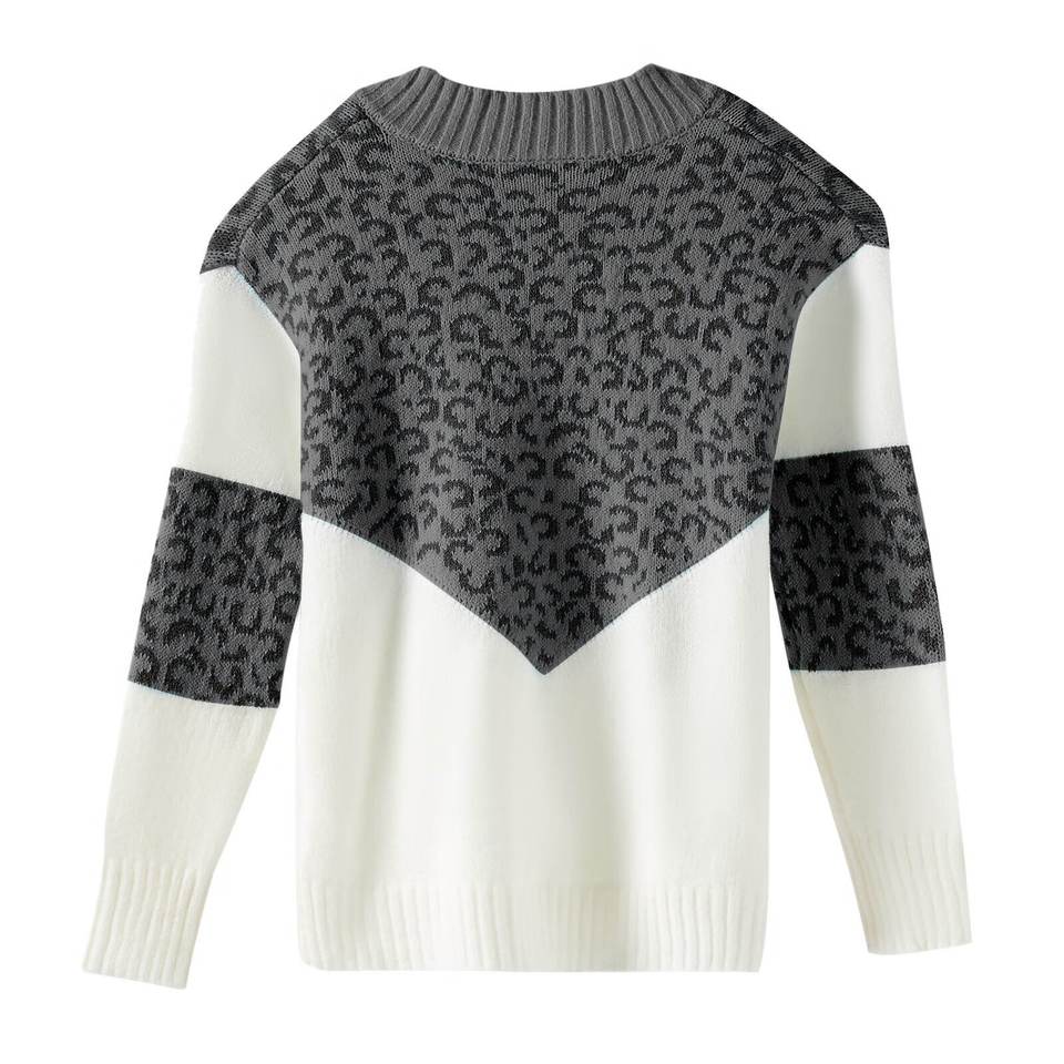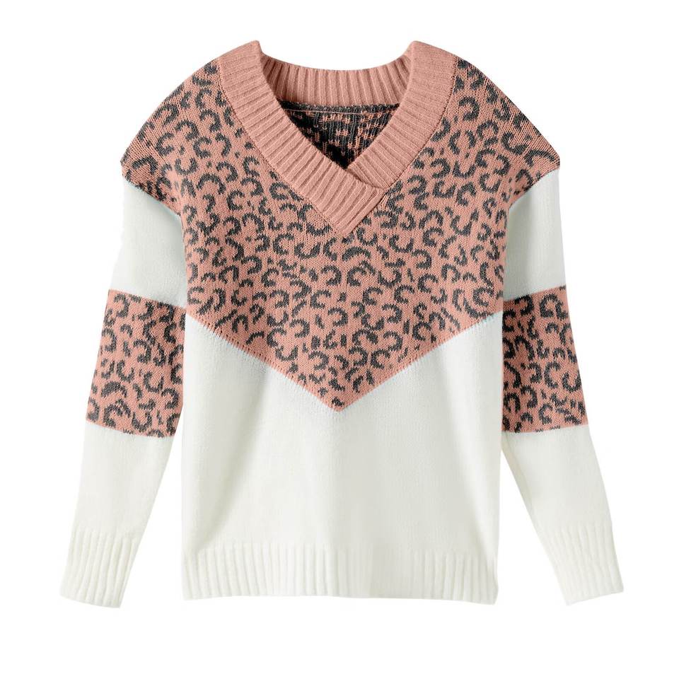 Product Type:7GG Computer Knitted Sweater Leopard Print Color Block Striped V Neck