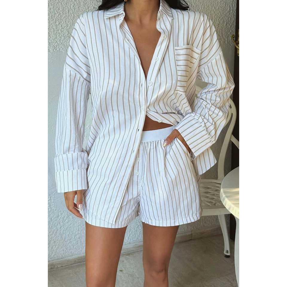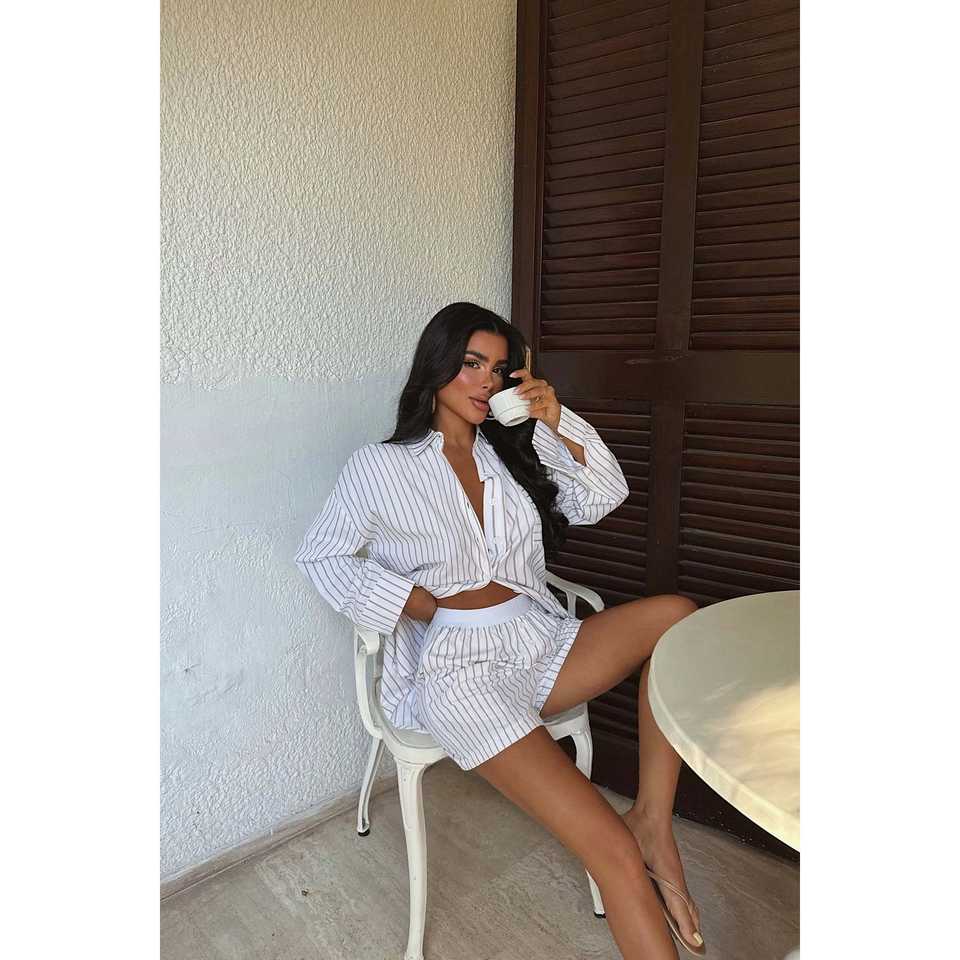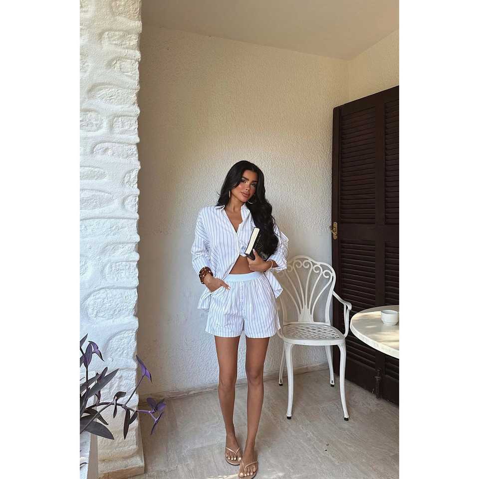 ชุดเซ็ตเสื้อผ้าลำลองผู้หญิงลายทางสีเหลือง ผ้าถักทอ ความยาวเหนือเข่า สำหรับฤดูร้อน