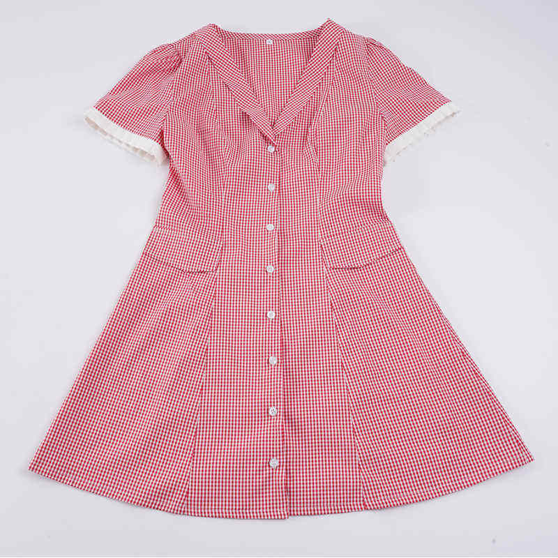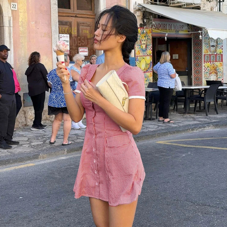 ชุดเดรสลายตารางหมากรุกคอวีติดกระดุมสำหรับผู้หญิง ชุดเดรสสั้นทรงเอแขนสั้นเซ็กซี่สไตล์วินเทจสำหรับฤดูร้อน สวมใส่ได้ทุกวันและเหมาะสำหรับงานปาร์ตี้