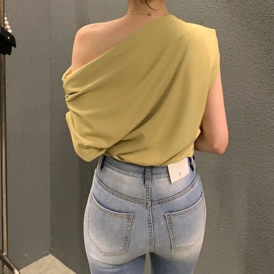 เสื้อยืดแขนสั้นผู้หญิง ดีไซน์เก๋ไก๋สำหรับฤดูร้อน ทรงไหล่เฉียงแบบไม่สมมาตร สีพื้น ทรงหลวม แฟชั่น