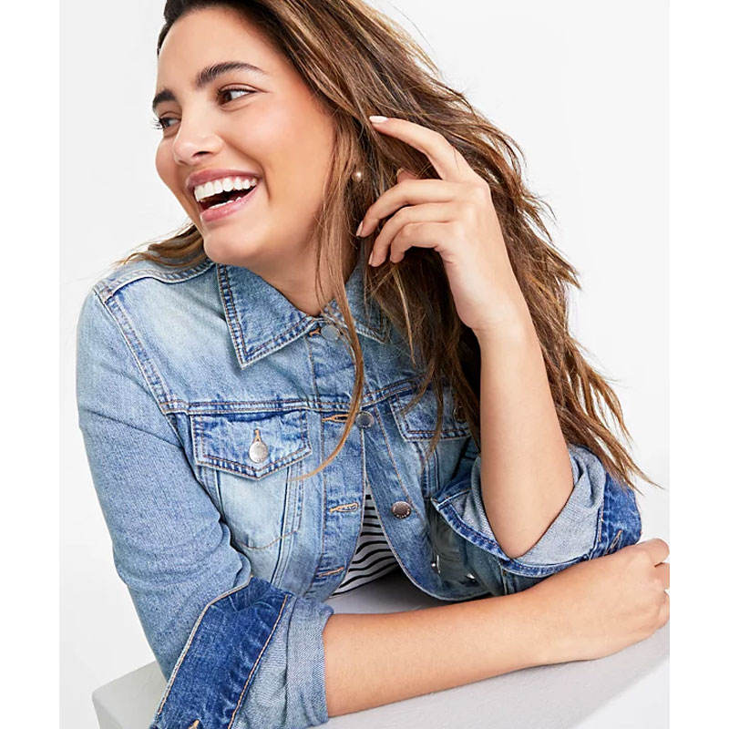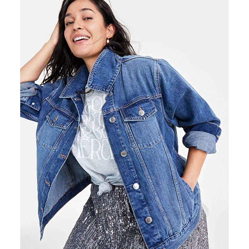 แจ็กเก็ตยีนส์ทรูเกอร์สำหรับผู้หญิงคลาสสิกผ้าสแปนเด็กซ์ใส่สบายเนื้อผ้าฝ้ายบุผ้าสแปนเด็กซ์แฟชั่นสไตล์ลำลองปักหมุด