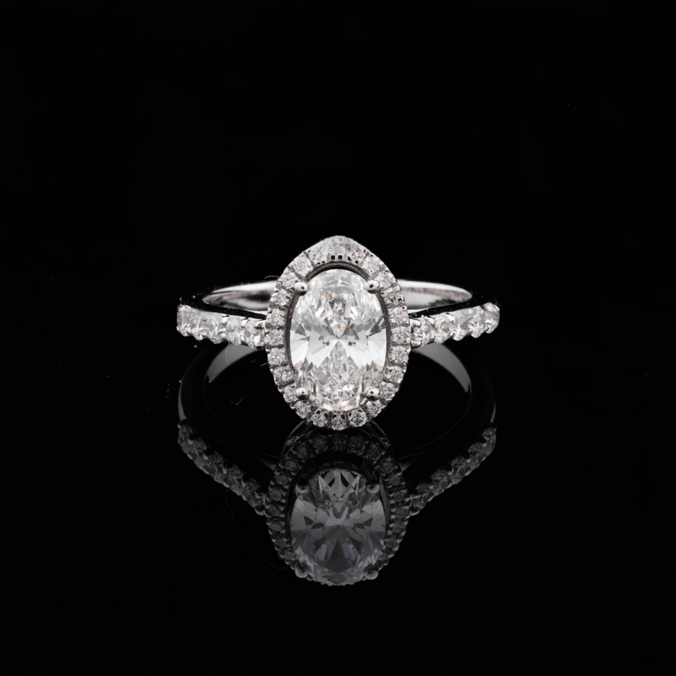 แหวนหมั้นผู้หญิงสไตล์วินเทจคลาสสิก เพชรขาวเม็ดใหญ่ มอยส์ซาไนต์ สแตนเลสชุบแพลตตินั่ม รูปทรงวงรี ประดับเพชร IGI