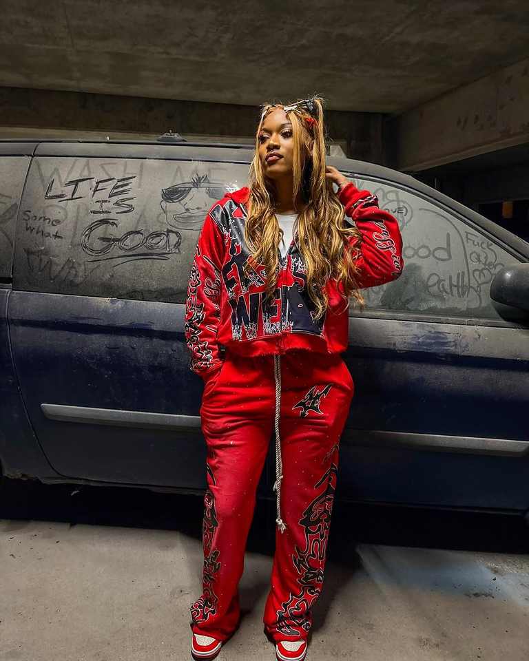 เสื้อผ้าของผู้หญิงชุด2ชิ้นเสื้อครอปและกางเกงวอร์มแบบลำลองพิมพ์ลายกราฟิก