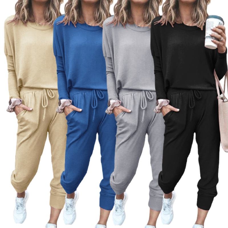 ชุดกีฬาสำหรับผู้หญิงชุดใส่วิ่งกางเกงแขนยาวสีพื้นทรงหลวมใหม่ฤดูใบไม้ร่วงและฤดูหนาว