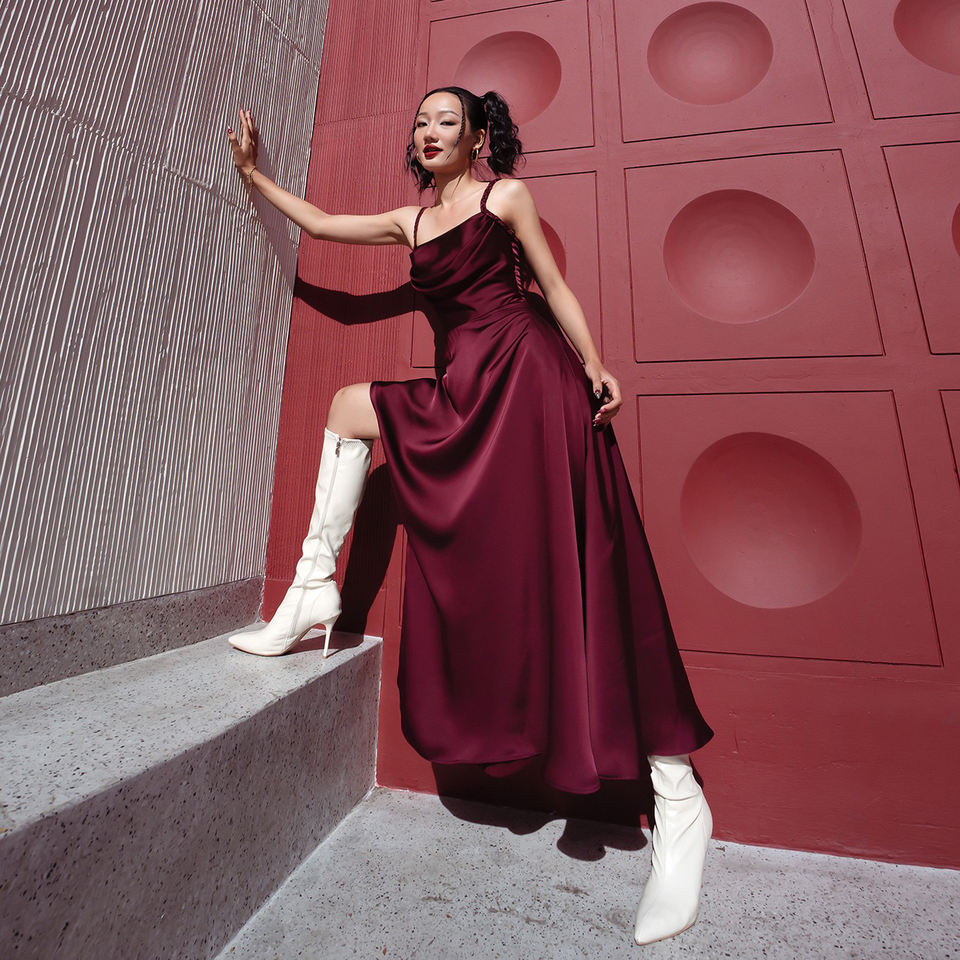 Technics:Satin midi dress with A-line cut and built-in padding.