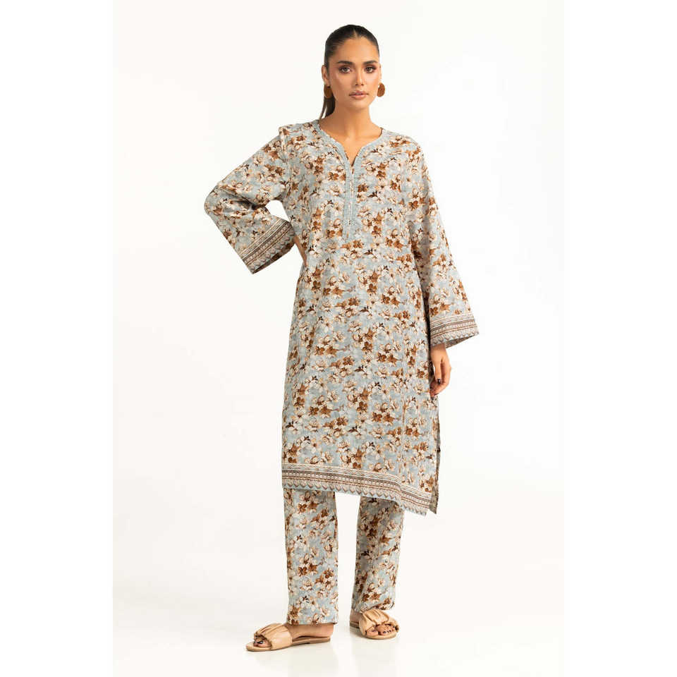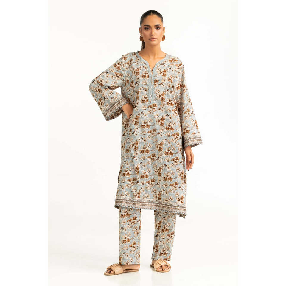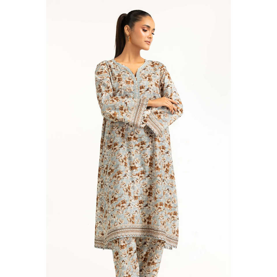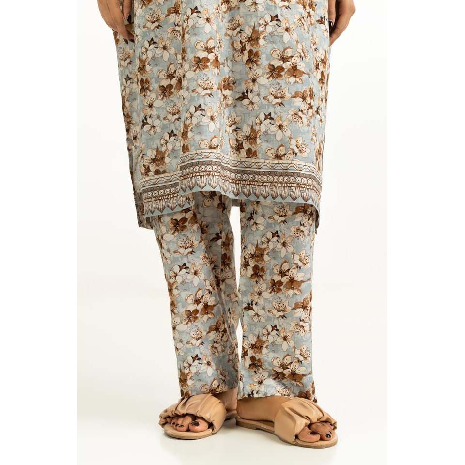 ชุดเซ็ตผู้หญิงสีฟ้าอ่อนลายพิมพ์ผ้าลอน ชุดสองชิ้นสำหรับใส่ลำลองในฤดูใบไม้ผลิ/ฤดูร้อน ไซส์ XS ถึง 3XL เหมาะสำหรับใส่ทำงาน