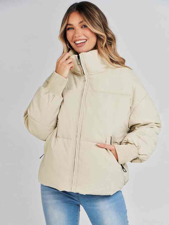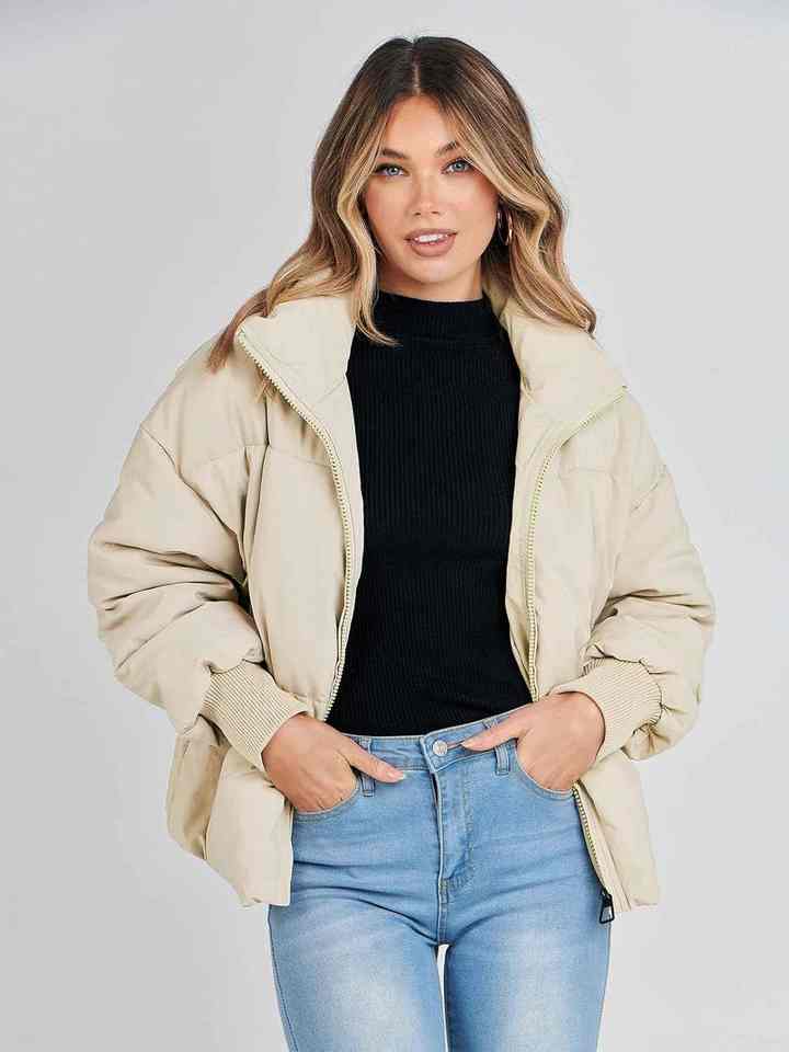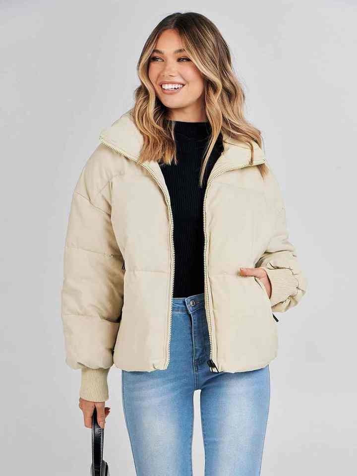 แจ็กเก็ตขนเป็ดผ้าโพลีเอสเตอร์สำหรับผู้หญิงปกเสื้อมีฮู้ดแขนยาวผ้าบุนวมให้ความอบอุ่นมีซิปปิดแฟชั่นใช้ทุกวัน