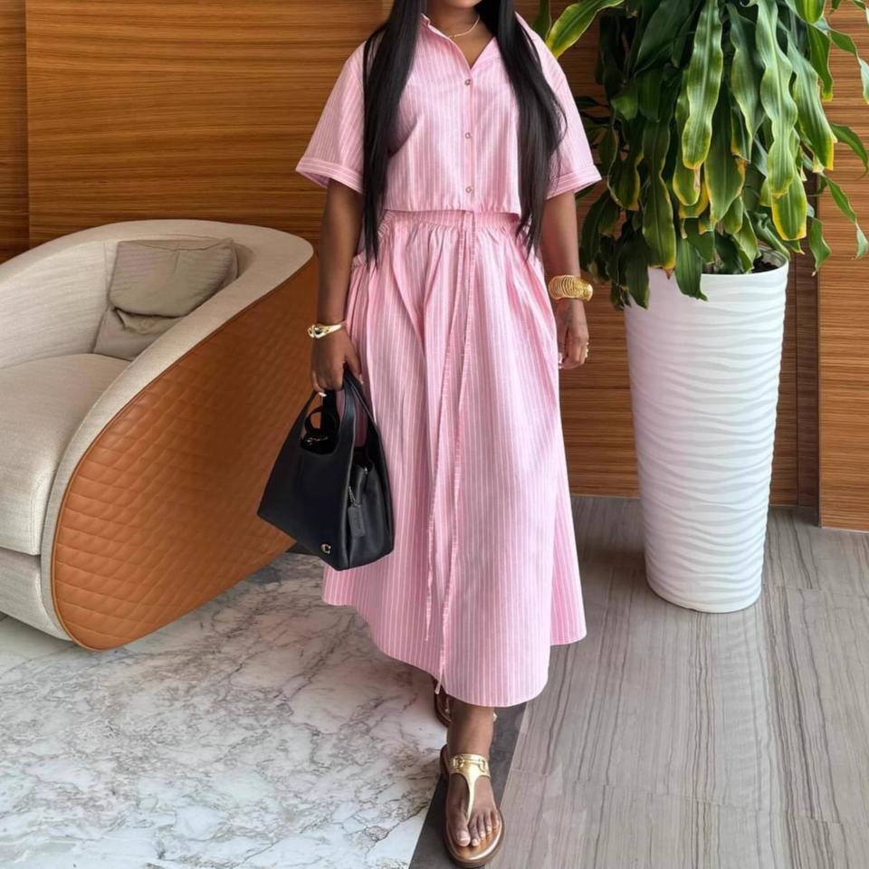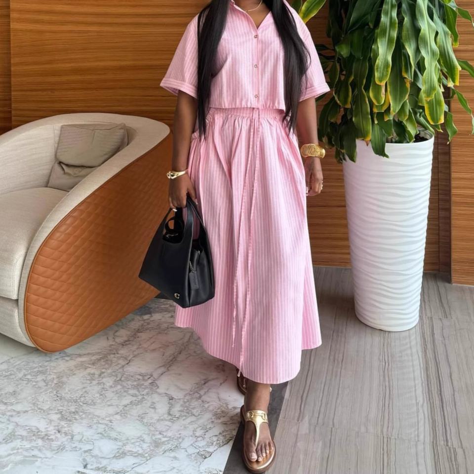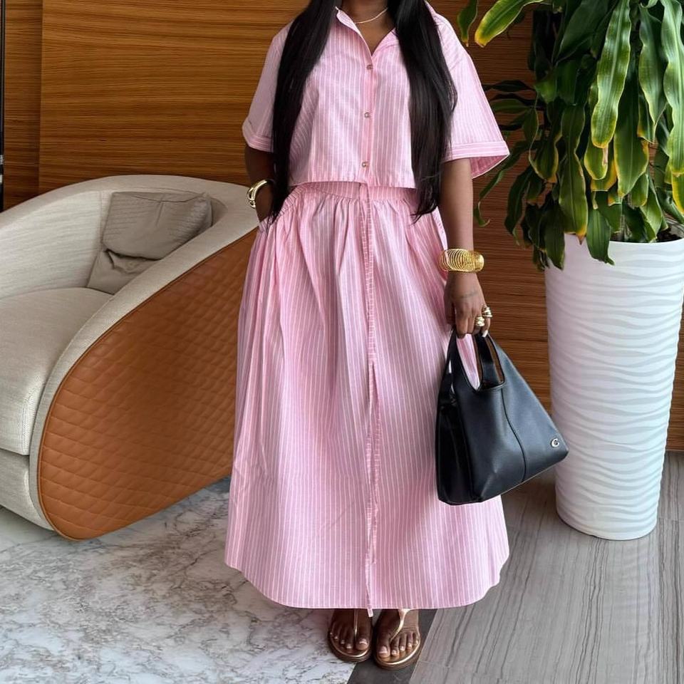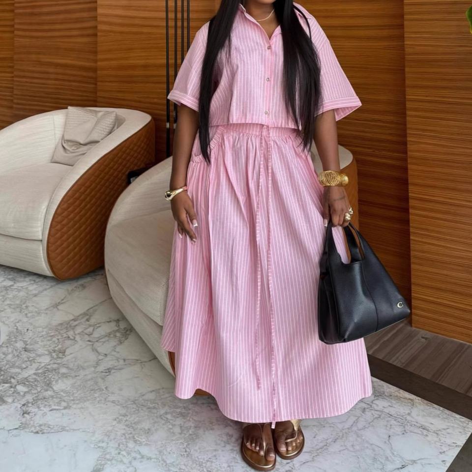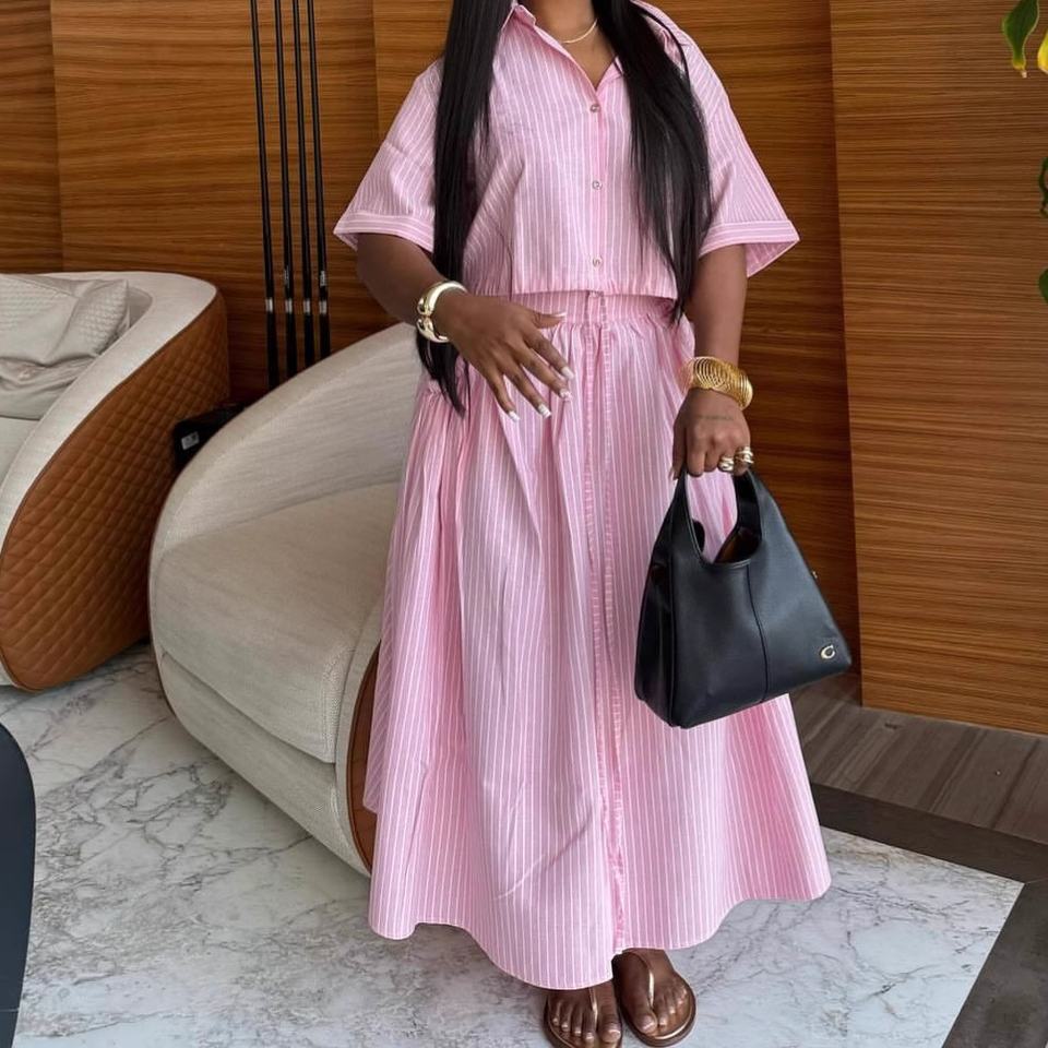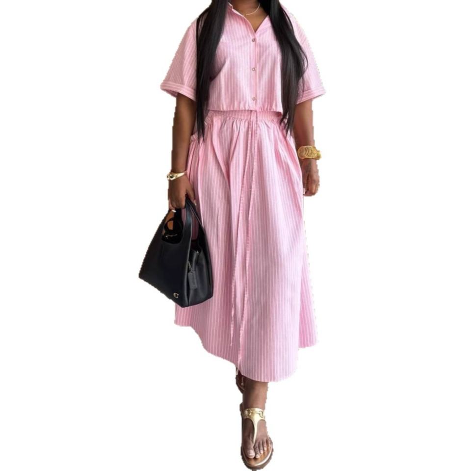 เสื้อเชิ้ตแขนสั้นลายทางคอปกสำหรับผู้หญิง กระโปรงทรงเข้ารูปเอวสูงผูกเอว สไตล์แอฟริกันใหม่ ชุดเซ็ต 2 ชิ้น แฟชั่น