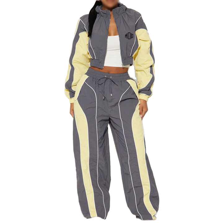 ชุดวอร์มครอปสีสันตัดกันสำหรับผู้หญิง สไตล์สปอร์ตสตรีทแวร์ เสื้อแจ็คเก็ตน้ำหนักเบาพร้อมเชือกผูกเอว ขายส่งแบบ OEM