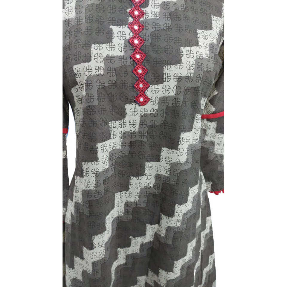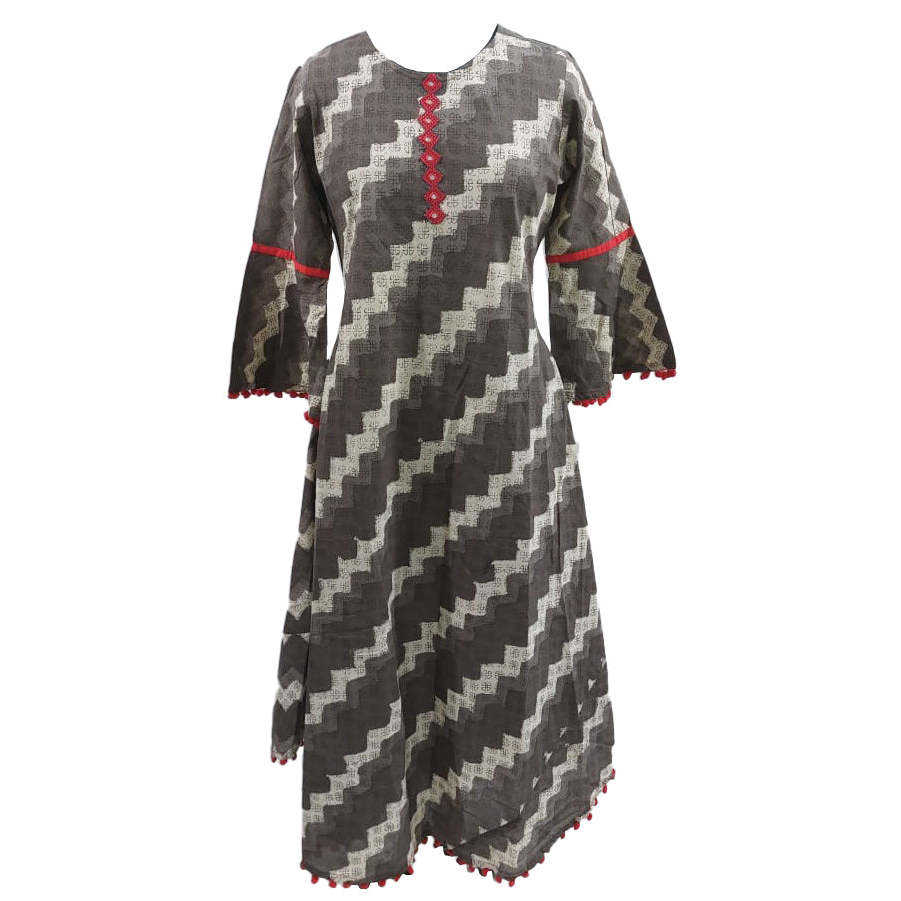 เสื้อคุर्ตาทรงเอไลน์ผ้าฝ้ายแคมบริกสีเบจสำหรับผู้หญิง พิมพ์ลายซิกแซกประดับกระจก ดีไซน์ทันสมัย สวมใส่สบาย ความยาว 46 นิ้ว