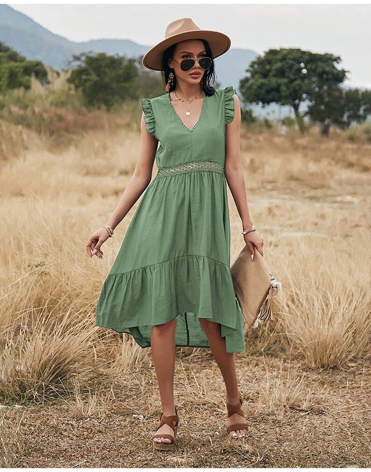 เดรสแม็กซี่คอลเลกชั่นคอวียาวถึงเข่าสำหรับผู้หญิง, ชุดเดรสยาวผ้าฝ้าย100% ย้อมสีล้วนคอลเลคชั่นใหม่ฤดูร้อน