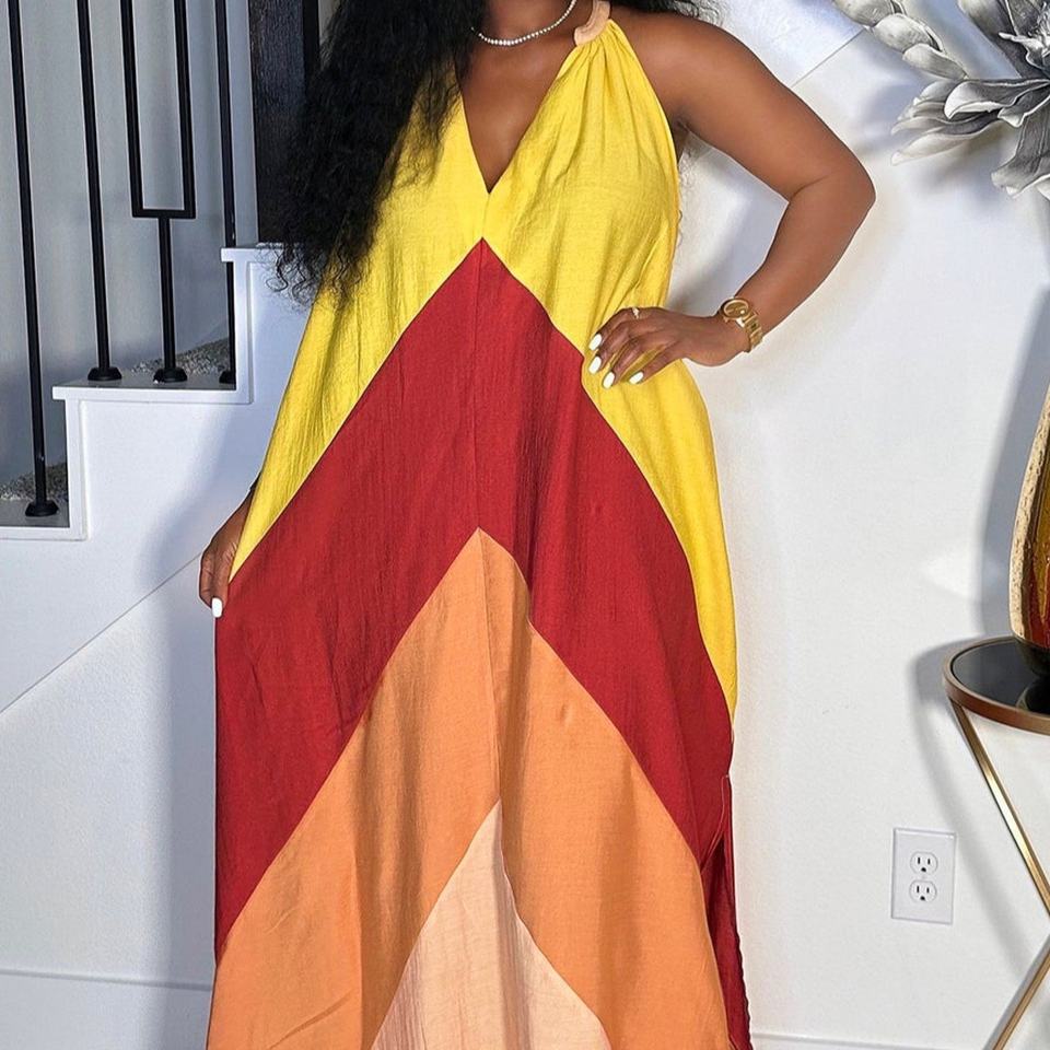ชุดเดรสวันหยุดแบบสบายๆ คอวี แขนกุด สีตัดกัน ทรงหลวม แฟชั่นสำหรับผู้หญิง