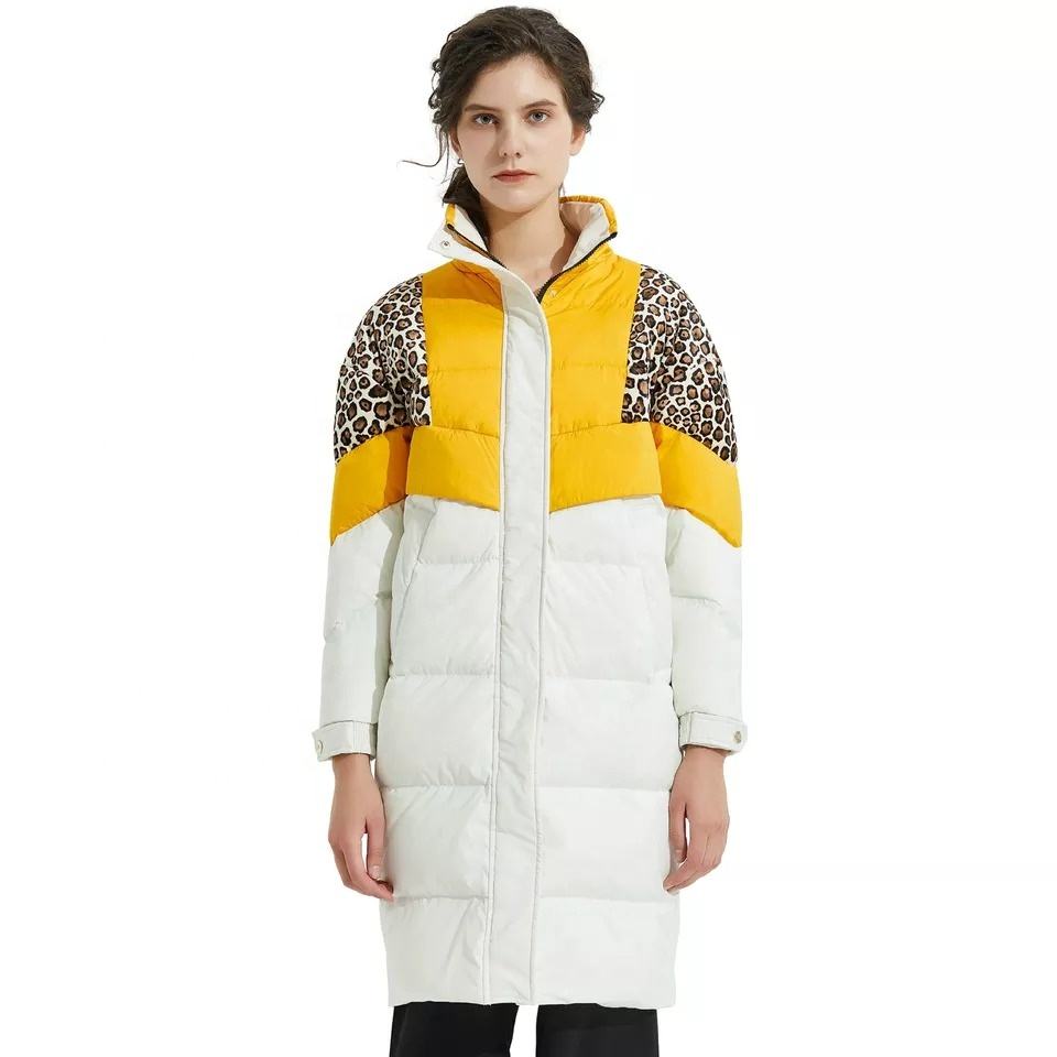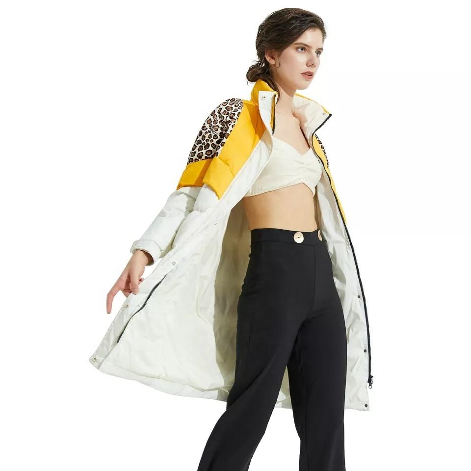 เสื้อโค้ทขนเป็ดมีฮู้ดผู้หญิง,แจ็คเก็ตขนเป็ดเนื้อผ้าหนาสีตัดกันเสื้อโค้ทให้ความอบอุ่นในฤดูหนาวพร้อมเสือดาว