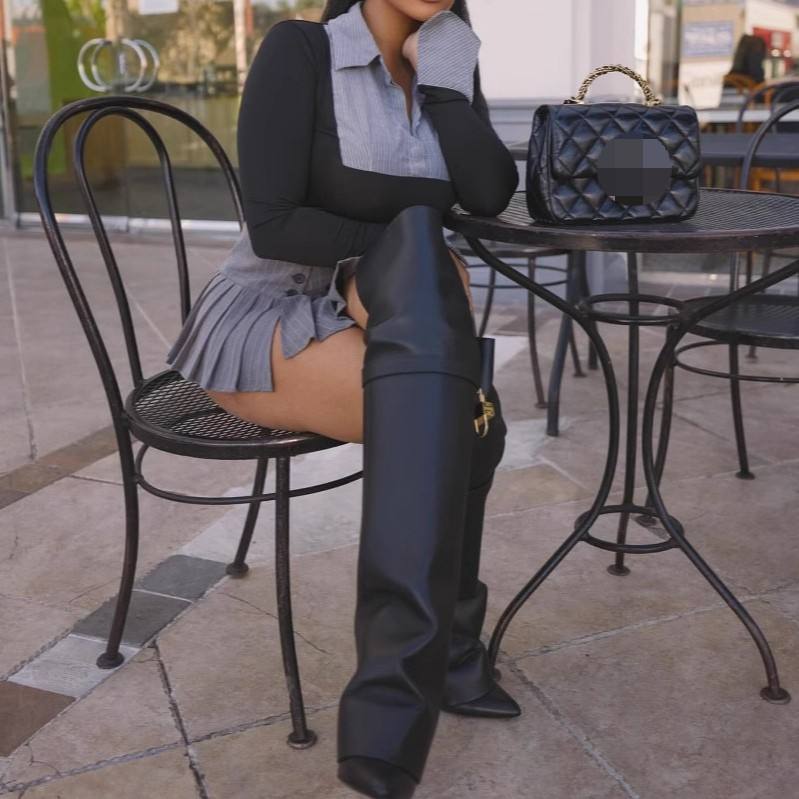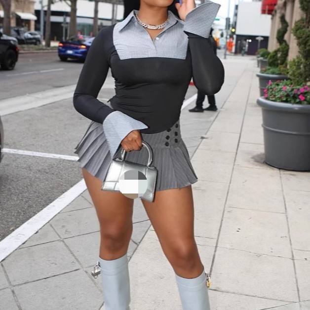 เสื้อแขนยาวทรงเข้ารูปสีตัดกันสำหรับผู้หญิงและกระโปรงจีบ ชุดลำลอง 2 ชิ้น แฟชั่น