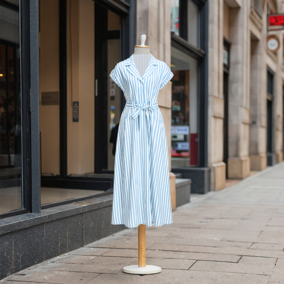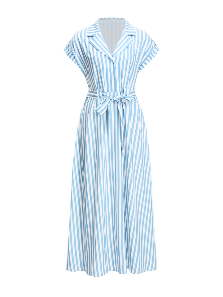 ชุดแมกซี่คอตตอนลินินสำหรับผู้หญิง, ชุดเดรสลำลองคอตตอนลินินเสื้อเชิ้ตลำลองกระดุมด้านหน้าลายทางสำหรับฤดูร้อน