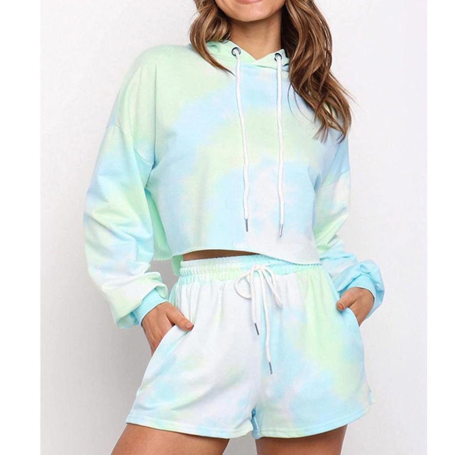 เสื้อสเวตเตอร์แบบสวมหัวสำหรับผู้หญิงเสื้อครอปมีฮู้ดกางเกงขาสั้นผ้าฟลีซแฟชั่นพร้อมเสื้อพิมพ์ลายย้อมสียาว