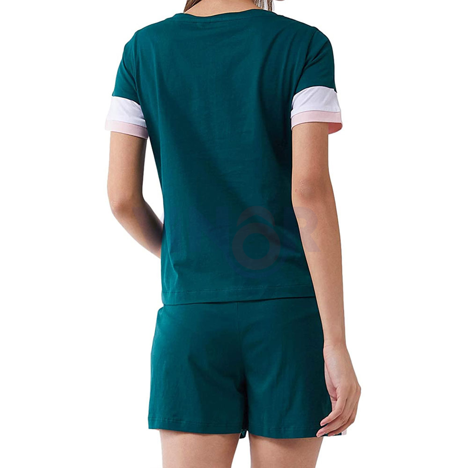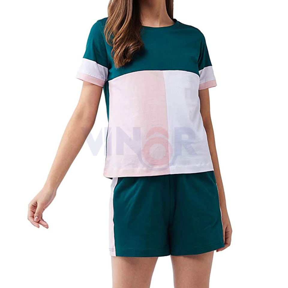ชุดเสื้อผ้าผ้าฝ้ายแบบคู่ของผู้หญิงเสื้อยืดและกางเกงขาสั้นลายสีทึบระบายอากาศได้สำหรับฤดูร้อน