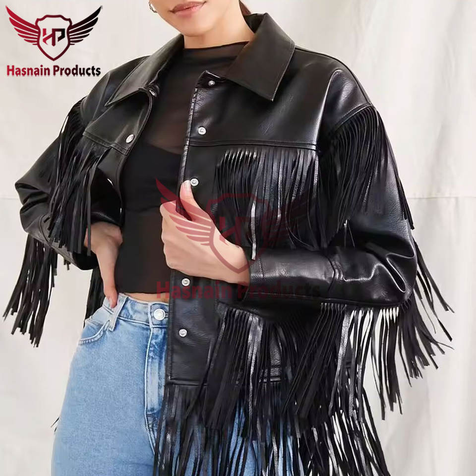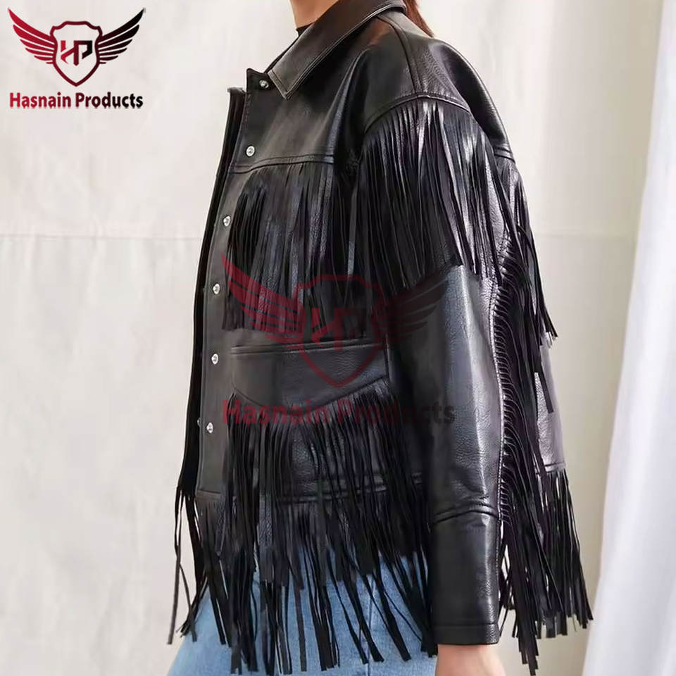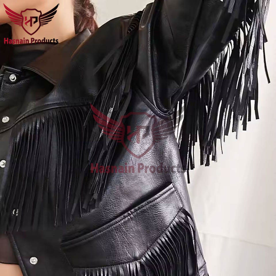 เสื้อแจ็คเก็ตหนังสีดําแท้ทํามือผู้หญิงคาวเกิร์ลตะวันตก & ลูกปัด - ฝีมือฝีมือคุณภาพสูง